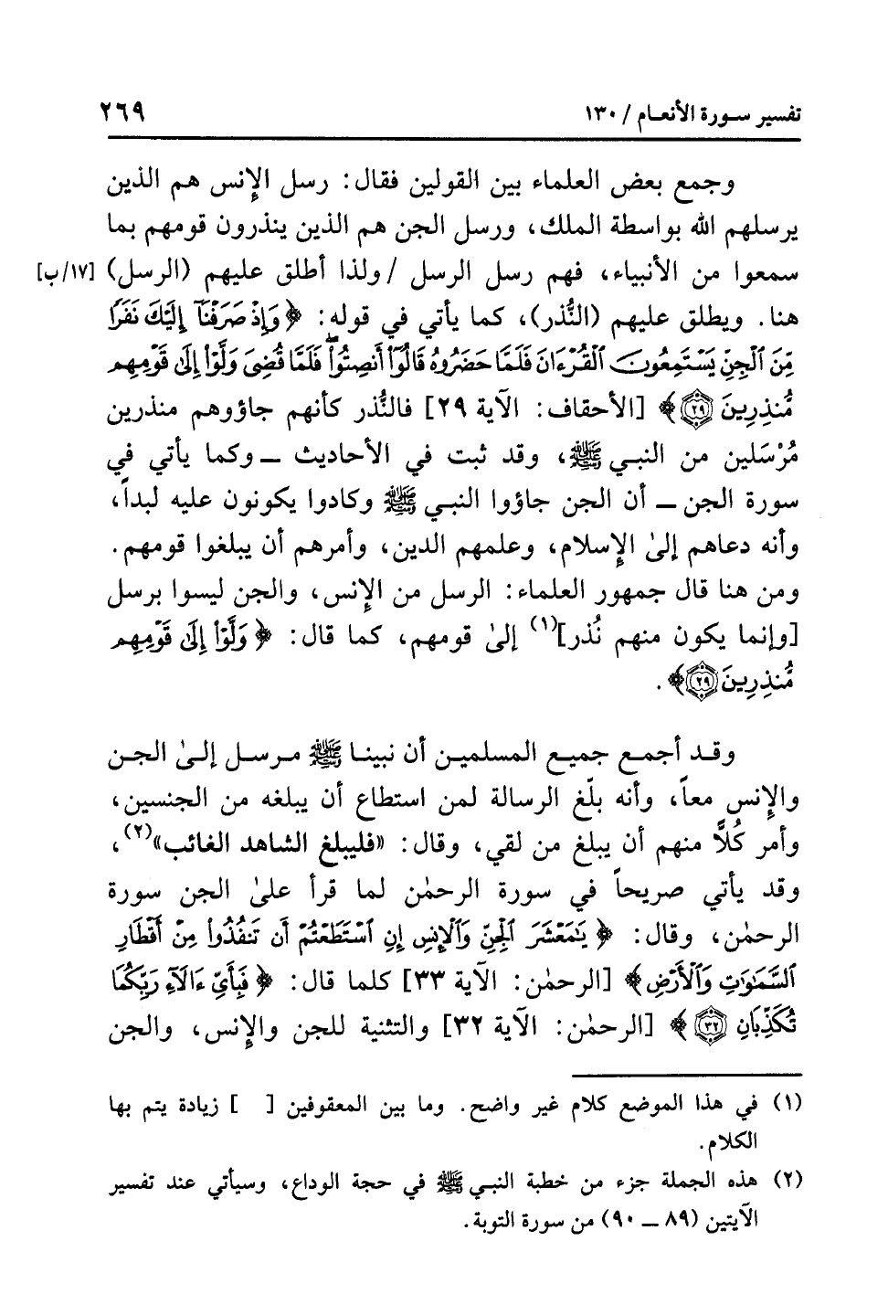 وقد أجمعَ جميعُ المسلمين أن نَبِيَّنَا - صلى الله عليه وسلم - مرسلٌ إلى الجنِّ والإنسِ مَعًا، وأنه بَلَّغَ الرسالةَ لِمَنِ استطاعَ أن يبلغَه من الجنسين، وَأَمَرَ كُلاًّ منهم أن يبلغَ مَنْ لَقِيَ، وقال: «فَلْيُبَلِّغِ الشَّاهِدُ الْغَائِبَ» (¬2)، وقد يأتي صريحًا في سورةِ الرحمنِ لَمَّا قَرَأَ على الجنِّ سورةَ الرحمنِ، وقال: {يَا مَعْشَرَ الْجِنِّ وَالْإِنْسِ إِنِ اسْتَطَعْتُمْ أَنْ تَنْفُذُوا مِنْ أَقْطَارِ السَّمَاوَاتِ وَالْأَرْضِ} [الرحمن: الآية 33] كلما قال: {فَبِأَيِّ آلاَءِ رَبِّكُمَا تُكَذِّبَانِ} [الرحمن: الآية 32] والتثنيةُ للجنِّ والإنسِ، والجنُّ