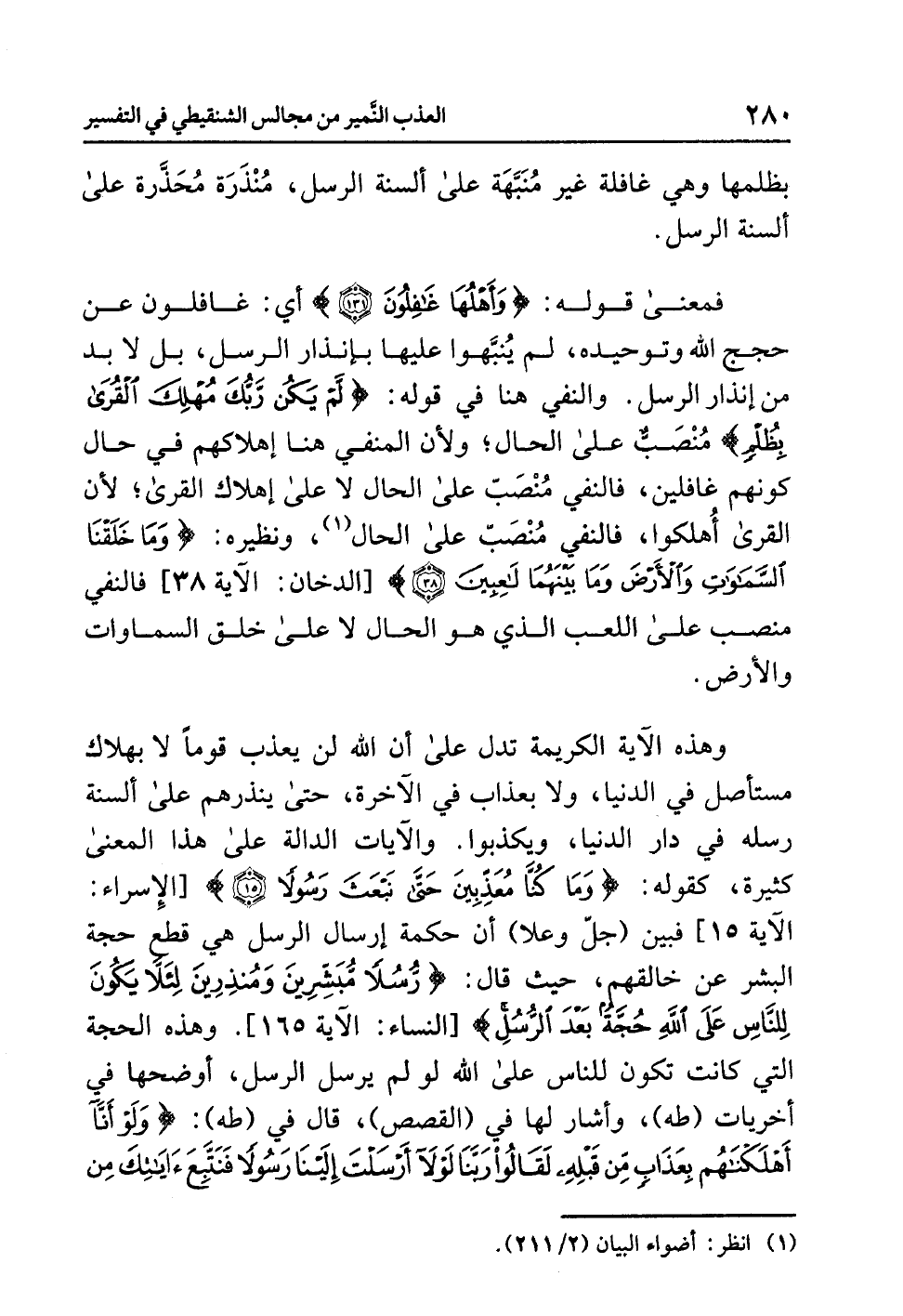 وهذه الآيةُ الكريمةُ تدلُّ على أن اللَّهَ لن يعذبَ قومًا لا بهلاكٍ مُسْتَأْصِلٍ في الدنيا، ولا بعذابٍ في الآخرةِ، حتى يُنْذِرَهُمْ على ألسنةِ رسلِه في دارِ الدنيا، وَيُكَذِّبُوا. والآياتُ الدالةُ على هذا المعنَى كثيرةٌ، كقولِه: {وَمَا كُنَّا مُعَذِّبِينَ حَتَّى نَبْعَثَ رَسُولاً} [الإسراء: الآية 15] فَبَيَّنَ (جل وعلا) أن حكمةَ إرسالِ الرسلِ هي قَطْعُ حجةِ البشرِ عن خالقِهم، حيث قال: {رُّسُلاً مُّبَشِّرِينَ وَمُنْذِرِينَ لِئَلاَّ يَكُونَ لِلنَّاسِ عَلَى اللَّهِ حُجَّةٌ بَعْدَ الرُّسُلِ} [النساء: الآية 165]. وهذه الحجةُ التي كانت تكونُ للناسِ على اللَّهِ لو لم يُرْسِلِ الرسلَ أَوْضَحَهَا في أخرياتِ (طه)، وأشارَ لها في (القصص)، قال في (طه): {وَلَوْ أَنَّا أَهْلَكْنَاهُم بِعَذَابٍ مِّنْ قَبْلِهِ لَقَالُوا رَبَّنَا لَوْلاَ أَرْسَلْتَ إِلَيْنَا رَسُولاً فَنَتَّبِعَ آيَاتِكَ مِنْ