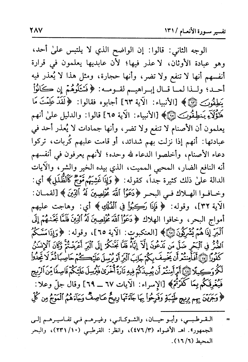 الوجهُ الثاني: قالوا: إن الواضحَ الذي لا يَلْتَبِسُ على أحدٍ، وهو عبادةُ الأوثانِ، لا عذرَ فيها؛ لأن عَابِدِيهَا يعلمونَ في قرارةِ أنفسِهم أنها لا تنفعُ ولا تَضُرُّ، وأنها حجارةٌ، ومثل هذا لا يُعْذَرُ فيه أحدٌ؛ ولذا لَمَّا قال إبراهيمُ لقومِه: {فَاسْأَلُوهُمْ إِنْ كَانُوا يَنْطِقُونَ (63)} [الأنبياء: الآية 63] أجابوه فقالوا: {لَقَدْ عَلِمْتَ مَا هَؤُلاَءِ يَنْطِقُونَ (65)} [الأنبياء: الآية 65] قالوا: والدليلُ على أنهم يعلمونَ أن الأصنامَ لاَ تنفعُ ولاَ تَضُرُّ، وأنها جماداتٌ لا يُعْذَرُ أحدٌ في عبادتِها: أنهم إذا نَزَلَتْ بهم شدائدُ، أو قامت عليهم كُرباتٌ تَرَكُوا دعاءَ الأصنامِ، وَأَخْلَصُوا الدعاءَ لِلَّهِ وحدَه؛ لأنهم يعرفونَ في أنفسِهم أنه النافعُ الضارُّ، الْمُحْيِي المميتُ، الذي بيدِه الخيرُ والشرُّ، والآياتُ الدالةُ على ذلك كثيرةٌ جِدًّا، كقولِه: {وَإِذَا غَشِيَهُم مَّوْجٌ كَالظُّلَلِ} أي: وخافوا الهلاكَ في البحرِ {دَعَوُا اللَّهَ مُخْلِصِينَ لَهُ الدِّينَ} [لقمان: الآية 32] وقوله: {فَإِذَا رَكِبُوا فِي الْفُلْكِ} أي: وَهَاجَتْ عليهم أمواجُ البحرِ، وَخَافُوا الهلاكَ: {دَعَوُا اللَّهَ مُخْلِصِينَ لَهُ الدِّينَ فَلَمَّا نَجَّاهُمْ إِلَى الْبَرِّ إِذَا هُمْ يُشْرِكُونَ (65)} [العنكبوت: الآية 65] وقولُه: {وَإِذَا مَسَّكُمُ الضُّرُّ فِي الْبَحْرِ ضَلَّ مَنْ تَدْعُونَ إِلاَّ إِيَّاهُ فَلَمَّا نَجَّاكُمْ إِلَى الْبَرِّ أَعْرَضْتُمْ وَكَانَ الإِنْسَانُ كَفُورًا (67) أَفَأَمِنْتُمْ أَنْ يَخْسِفَ بِكُمْ جَانِبَ الْبَرِّ أَوْ يُرْسِلَ عَلَيْكُمْ حَاصِبًا ثُمَّ لاَ تَجِدُوا لَكُمْ وَكِيلاً (68) أَمْ أَمِنْتُمْ أَنْ يُعِيدَكُمْ فِيهِ تَارَةً أُخْرَى فَيُرْسِلَ عَلَيْكُمْ قَاصِفًا مِنَ الرِّيحِ فَيُغْرِقَكُمْ بِمَا كَفَرْتُمْ} [الإسراء: الآيات 67 - 69] وقال جل وعلا: {وَجَرَيْنَ بِهِمْ بِرِيحٍ طَيِّبَةٍ وَفَرِحُوا بِهَا جَاءَتْهَا رِيحٌ عَاصِفٌ وَجَاءَهُمُ الْمَوْجُ مِنْ كُلِّ