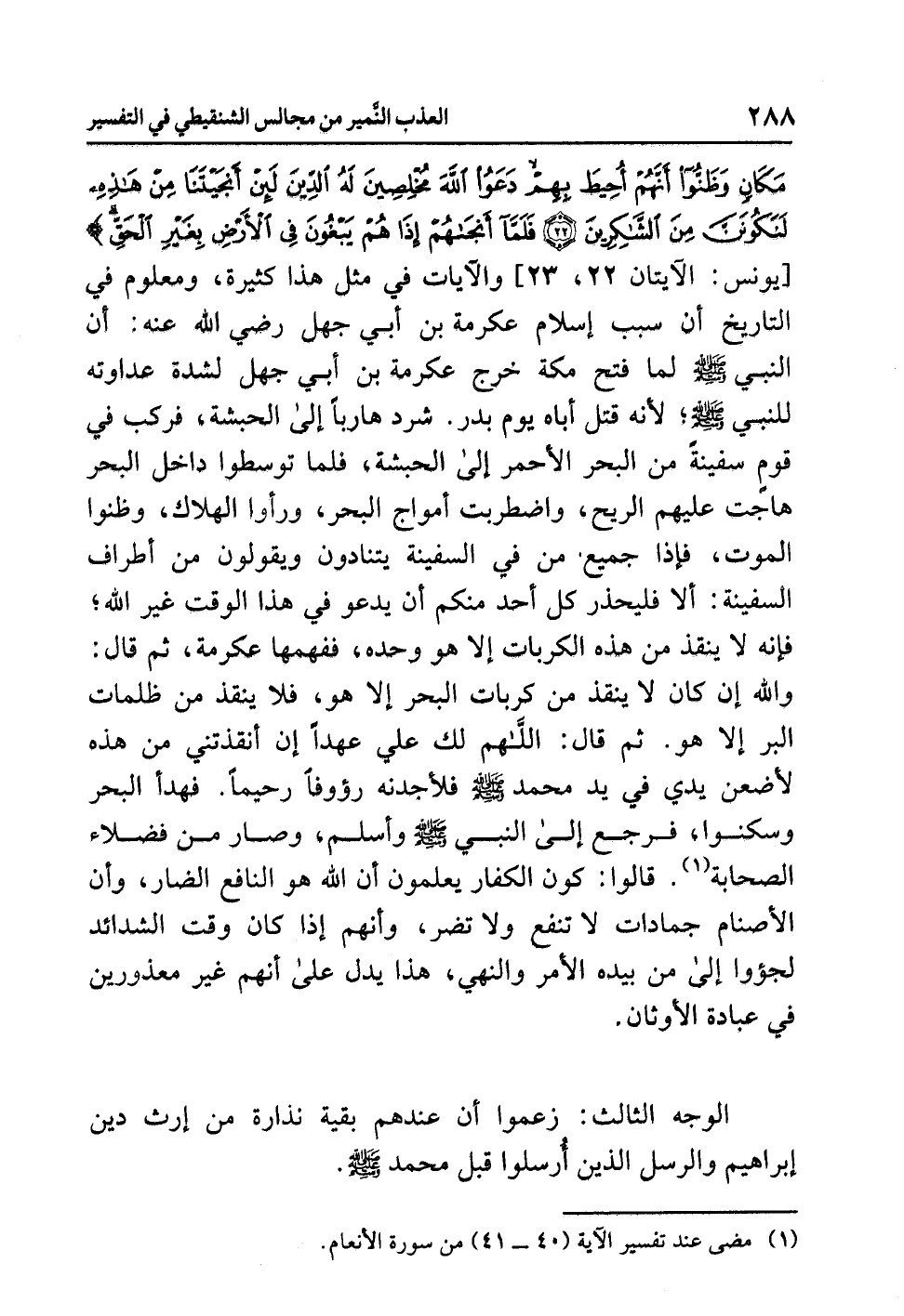 أَنْجَيْتَنَا مِنْ هَذِهِ لَنَكُونَنَّ مِنَ الشَّاكِرِينَ (22) فَلَمَّا أَنْجَاهُمْ إِذَا هُمْ يَبْغُونَ فِي الأرْضِ بِغَيْرِ الْحَقِّ} [يونس: الآيتان 22، 23] والآياتُ في مثل هذا كثيرةٌ، ومعلومٌ في التاريخِ أن سببَ إسلامِ عكرمةَ بنِ أبي جهلٍ رضي الله عنه: أن النبيَّ - صلى الله عليه وسلم - لَمَّا فَتَحَ مكةَ خَرَجَ عكرمةُ بنُ أَبِي جهلٍ لشدةِ عداوتِه للنبيِّ - صلى الله عليه وسلم -؛ لأنه قَتَلَ أَبَاهُ يومَ بدرٍ. شَرَدَ هاربًا إلى الحبشةِ، فَرَكِبَ في قومٍ سفينةً من البحرِ الأحمرِ إلى الحبشةِ، فَلَمَّا تَوَسَّطُوا دَاخِلَ البحرِ هَاجَتْ عليهم الريحُ، وَاضْطَرَبَتْ أمواجُ البحرِ، ورأوا الهلاكَ، وَظَنُّوا الموتَ، فإذا جميعُ مَنْ في السفينةِ يَتَنَادَوْنَ ويقولونَ من أطرافِ السفينةِ: أَلاَ فَلْيَحْذَرْ كُلُّ أحدٍ منكم أن يدعوَ في هذا الوقتِ غيرَ اللَّهِ؛ فإنه لا يُنْقِذُ من هذه الكرباتِ إلا هو وحدَه، فَفَهِمَهَا عكرمةُ، ثم قال: وَاللَّهِ إن كانَ لا ينقذُ من كرباتِ البحرِ إلا هو، فلاَ ينقذُ من ظلماتِ البرِّ إلا هو. ثم قال: اللَّهُمَّ لكَ عَلَيَّ عَهْدًا إن أنقذتني من هذه لأَضَعَنَّ يدي في يدِ محمدٍ - صلى الله عليه وسلم - فَلأَجِدَنَّهُ رَؤُوفًا رحيمًا. فهدأ البحرُ وسكنوا، فرجعَ إلى النبيِّ - صلى الله عليه وسلم - وَأَسْلَمَ، وصارَ من فضلاءِ الصحابةِ (¬1). قالوا: كونُ الكفارِ يعلمونَ أن اللَّهَ هو النافعُ الضارُّ، وأن الأصنامَ جماداتٌ لا تنفعُ ولا تضرُّ، وأنهم إذا كان وقتُ الشدائدِ لجؤوا إلى مَنْ بِيَدِهِ الأمرُ والنهيُ، هذا يدلُّ على أنهم غيرُ مَعْذُورِينَ في عبادةِ الأوثانِ.