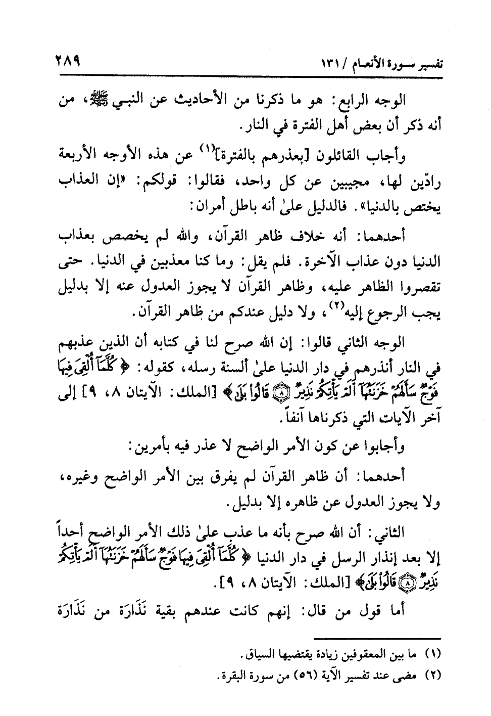 الوجهُ الثاني قالوا: إِنَّ اللَّهَ صَرَّحَ لنا في كتابِه أن الذين عَذَّبَهُمْ في النارِ أَنْذَرَهُمْ في دارِ الدنيا على ألسنةِ رُسُلِهِ، كقولِه: {كُلَّمَا أُلْقِيَ فِيهَا فَوْجٌ سَأَلَهُمْ خَزَنَتُهَا أَلَمْ يَأْتِكُمْ نَذِيرٌ (8) قَالُوا بَلَى} [الملك: الآيتان 8، 9] إلى آخِرِ الآياتِ التي ذَكَرْنَاهَا آنِفًا.