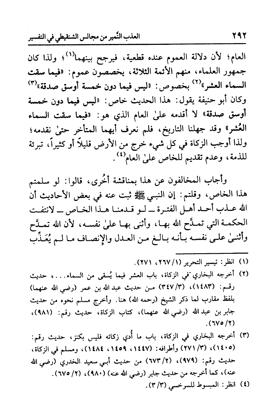 (¬2) أخرجه البخاري في الزكاة، باب العشر فيما يُسقى من السماء ... ، حديث رقم: (1483)، (3/ 347) من حديث عبد الله بن عمر (رضي الله عنهما) بلفظ مقارب لما ذكر الشيخ (رحمه الله) هنا. وأخرج مسلم نحوه من حديث جابر بن عبد الله (رضي الله عنهما)، كتاب الزكاة، حديث رقم: (981)، (2/ 675).