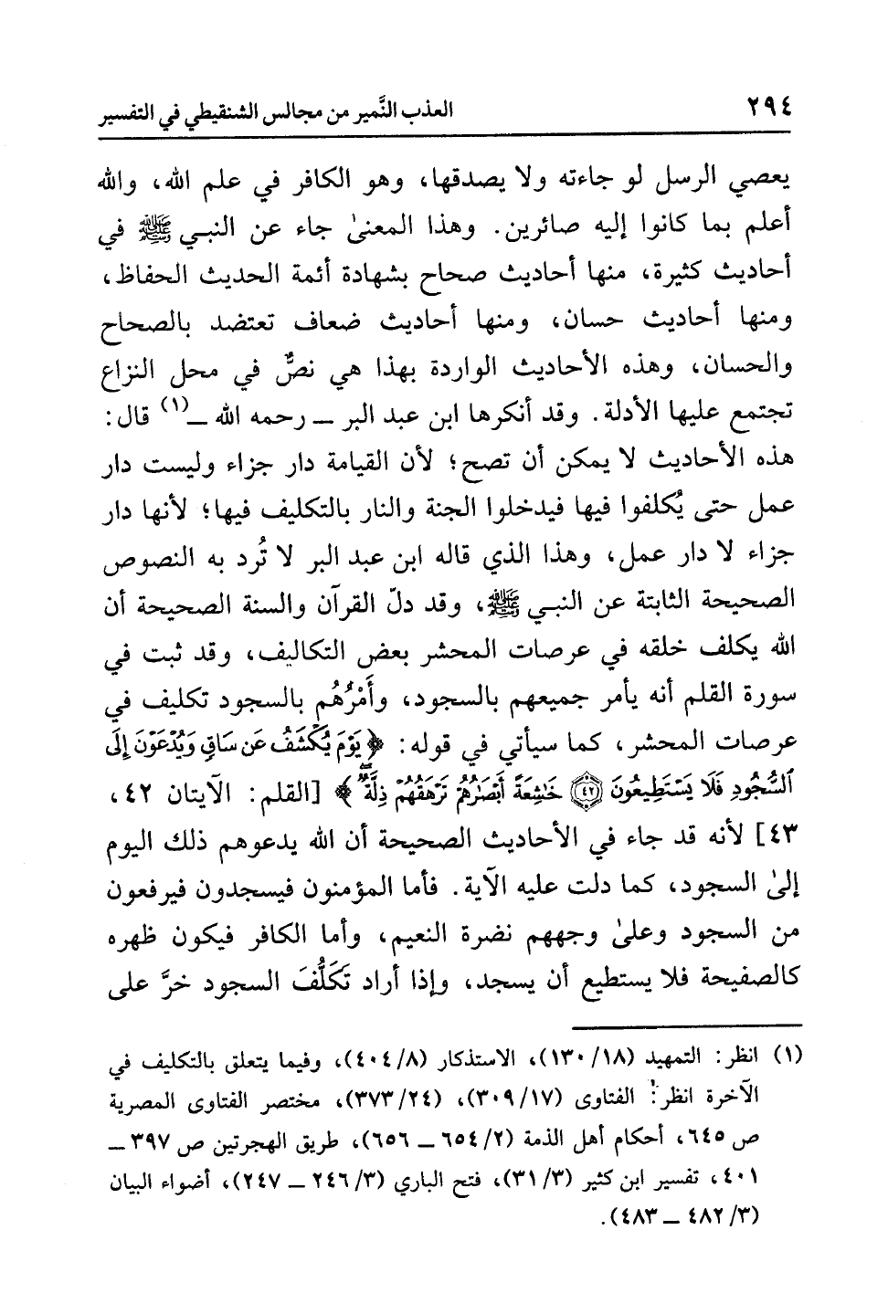 يَعْصِي الرسلَ لو جَاءَتْهُ ولاَ يُصَدِّقُهَا، وهو الكافرُ في عِلْمِ اللَّهِ، وَاللَّهُ أَعْلَمُ بما كَانُوا إليه صَائِرِينَ. وهذا المعنَى جَاءَ عن النبيِّ - صلى الله عليه وسلم - في أحاديثَ كثيرةٍ، منها أحاديثُ صحاحٌ بشهادةِ أئمةِ الحديثِ الْحُفَّاظِ، ومنها أحاديثُ حِسَانٌ، ومنها أحاديثُ ضعافٌ تَعْتَضِدُ بالصحاحِ وَالْحِسَانِ، وهذه الأحاديثُ الواردةُ بهذا هي نَصٌّ في مَحَلِّ النزاعِ تجتمعُ عليها الأدلةُ. وقد أَنْكَرَهَا ابنُ عبدِ البرِّ - رحمه الله (2) - قال: هذه الأحاديثُ لاَ يمكنُ أن تَصِحَّ؛ لأن القيامةَ دارُ جزاءٍ وليست دارَ عملٍ حتى يُكَلَّفُوا فيها فيدخلوا الجنةَ والنارَ بالتكليفِ فيها؛ لأنها دارُ جزاءٍ لا دارَ عملٍ، وهذا الذي قَالَهُ ابنُ عبدِ البرِّ لاَ تُرَدُّ به النصوصُ الصحيحةُ الثابتةُ عن النبيِّ - صلى الله عليه وسلم -، وقد دَلَّ القرآنُ والسنةُ الصحيحةُ أن اللَّهَ يكلفُ خلقَه في عرصاتِ المحشرِ بعضَ التكاليفِ، وقد ثَبَتَ في سورةِ القلمِ أنه يَأْمُرُ جميعَهم بالسجودِ، وأَمْرُهُمْ بالسجودِ تكليفٌ في عرصاتِ المحشرِ، كما سيأتِي فيِ قولِه: {يَوْمَ يُكْشَفُ عَنْ سَاقٍ وَيُدْعَوْنَ إِلَى السُّجُودِ فَلاَ يَسْتَطِيعُونَ (42) خَاشِعَةً أَبْصَارُهُمْ تَرْهَقُهُمْ ذِلَّةٌ} [القلم: الآيتان 42، 43] لأنه قد جاءَ في الأحاديثِ الصحيحةِ أن اللَّهَ يدعوهم ذلك اليومَ إلى السجودِ، كما دَلَّتْ عليه الآيةُ.
