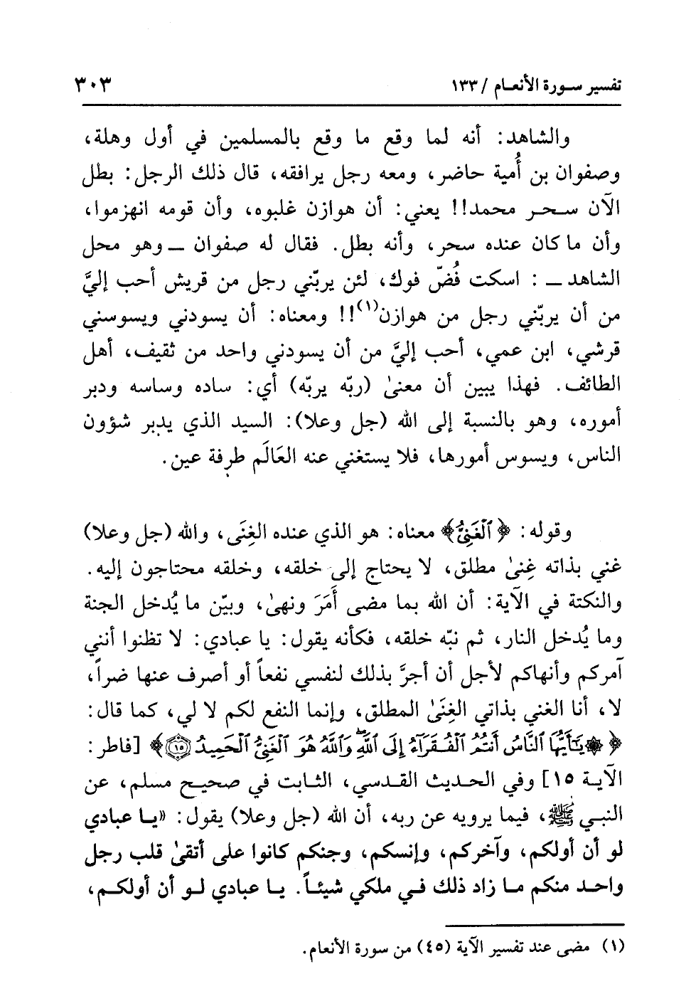 قولُه: {الْغَنِيُّ} معناه: هو الذي عنده الغِنَى، واللَّهُ (جل وعلا) غَنِيٌّ بذاتِه غِنًى مُطْلَقًا، لا يحتاج إلى خَلْقِهِ، وخلقُه محتاجونَ إليه. والنكتةُ في الآيةِ: أن اللَّهَ بما مَضَى أَمَرَ وَنَهَى، وَبَيَّنَ ما يُدْخِلُ الجنةَ وما يُدْخِلُ النارَ، ثم نَبَّهَ خلقَه، فكأنه يقولُ: يا عبادي: لا تَظُنُّوا أنني آمُرُكُمْ وَأَنْهَاكُمْ لأَجْلِ أن أَجُرَّ بذلك لنفسِي نفعًا أو أصرفَ عنها ضُرًّا، لا، أنا الغنيُّ بذاتِي الغِنَى المطلق، وإنما النفعُ لكم لا لِي، كما قال: {يَا أَيُّهَا النَّاسُ أَنْتُمُ الْفُقَرَاءُ إِلَى اللَّهِ وَاللَّهُ هُوَ الْغَنِيُّ الْحَمِيدُ} [فاطر: الآية 15] وفي الحديثِ القدسيِّ، الثابتِ في صحيحِ مسلمٍ، عن النبيِّ - صلى الله عليه وسلم -، فيما يَرْوِيهِ عن رَبِّهِ، أن اللَّهَ (جل وعلا) يقولُ: «يَا عِبَادِي لَوْ أَنَّ أَوَّلَكُمْ وَآخِرَكُمْ وَإِنْسَكُمْ وَجِنَّكُمْ كَانُوا عَلَى أَتْقَى قَلْبِ رَجُلٍ وَاحِدٍ مِنْكُمْ مَا زَادَ ذَلِكَ فِي مُلْكِي شَيْئًا. يَا عِبَادِي لَوْ أَنَّ أَوَّلَكُمْ