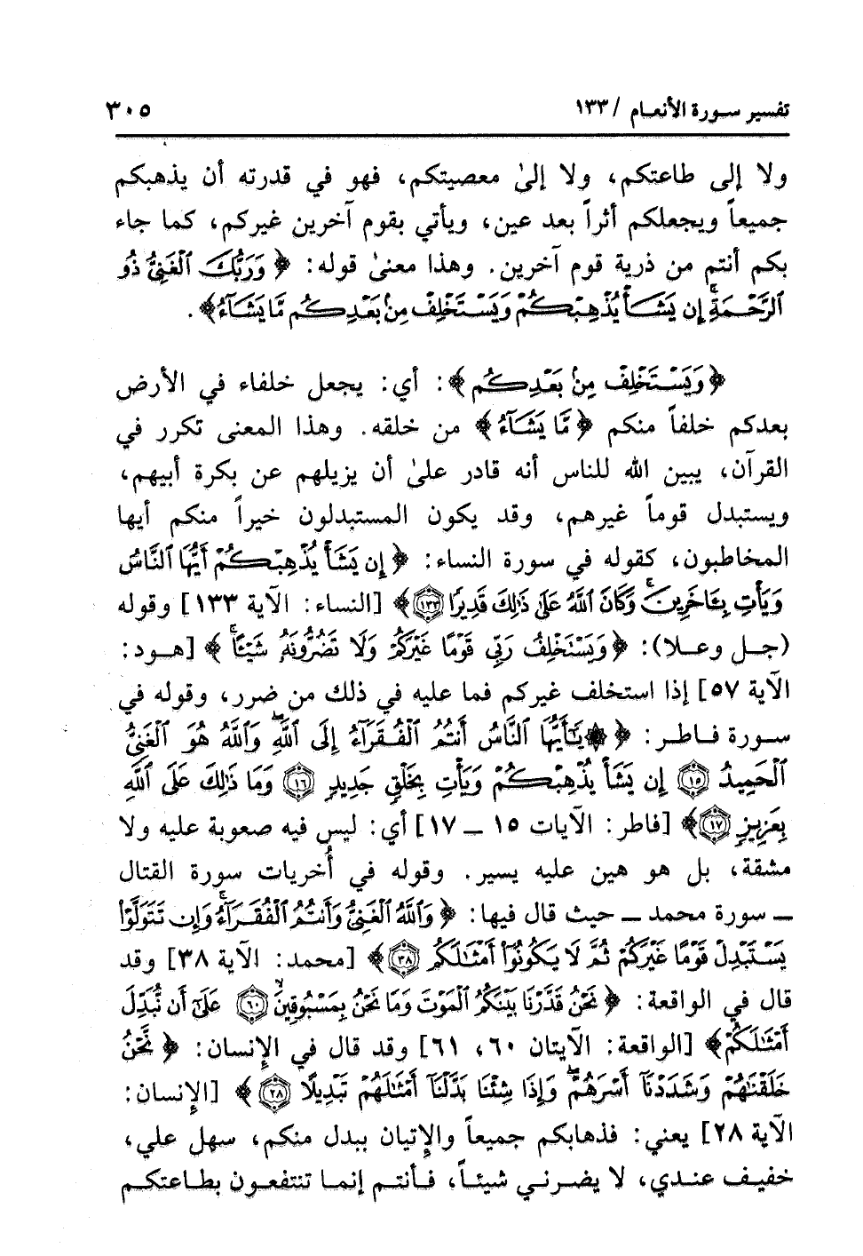 ولا إلى طاعتِكم، ولا إلى معصيتِكم، فهو في قدرتِه أن يذهبَكم جميعًا ويجعلَكم أثرًا بعدَ عَيْنٍ، ويأتي بقومٍ آخرِينَ غيركم، كما جاء بكم أَنْتُمْ من ذريةِ قومٍ آخَرِينَ. وهذا معنَى قولِه: {وَرَبُّكَ الْغَنِيُّ ذُو الرَّحْمَةِ إِنْ يَشَأْ يُذْهِبْكُمْ وَيَسْتَخْلِفْ مِنْ بَعْدِكُم مَّا يَشَاءُ}.
