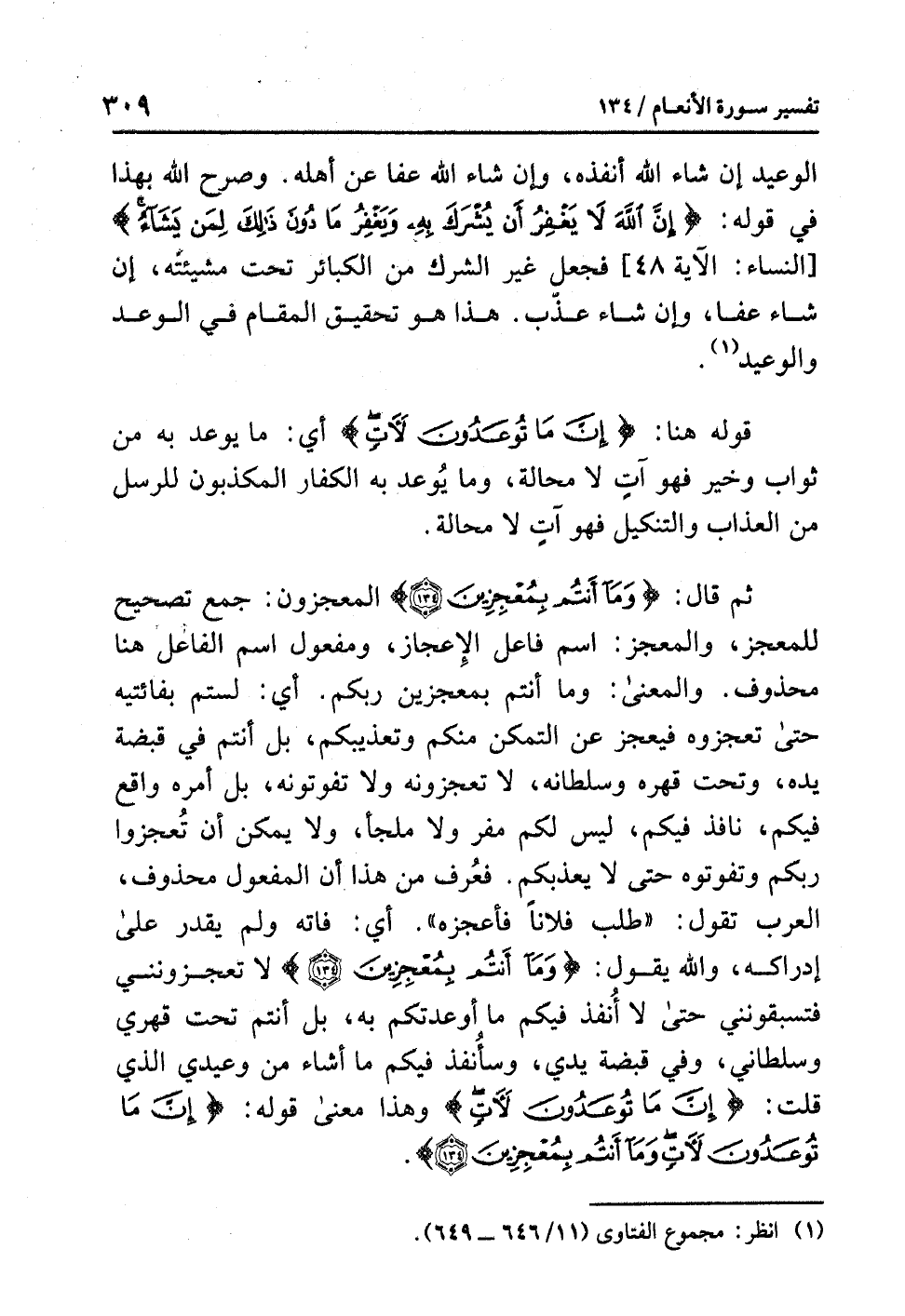 ثم قال: {وَمَا أَنْتُمْ بِمُعْجِزِينَ} المعجزونَ: جمعُ تصحيحٍ للمعجزِ، والمعجزُ: اسمُ فاعلِ الإعجازِ، ومفعولُ اسمِ الفاعلِ هنا محذوفٌ. والمعنَى: وما أنتم بمعجزينَ رَبَّكُمْ. أي: لستُم بِفَائِتِيهِ حتى تُعْجِزُوهُ فيعجزَ عن التمكنِ منكم وتعذيبِكم، بل أنتم في قبضةِ يدِه، وتحتَ قهرِه وسلطانِه، لا تُعْجِزُونَهُ ولا تَفُوتُونَهُ، بل أَمْرُهُ وَاقِعٌ فيكم، نافذٌ فيكم، ليس لكم مَفَرٌّ وَلاَ مَلْجَأٌ، ولا يمكنُ أن تُعجزوا رَبَّكُمْ وتفوتوه حتى لا يُعَذِّبَكُمْ. فَعُرِفَ من هذا أن المفعولَ محذوفٌ، العربُ تقول: «طَلَبَ فلانًا فَأَعْجَزَهُ». أي: فاتَه ولم يَقْدِرْ على إدراكِه، واللَّهُ يقولُ: {وَمَا أَنْتُمْ بِمُعْجِزِينَ} لا تُعْجِزُونَنِي فتسبقونني حتى لا أُنَفِّذَ فيكم ما أَوْعَدْتُكُمْ به، بل أَنْتُمْ تحتَ قَهْرِي وسلطانِي، وفي قبضةِ يدِي، وَسَأُنَفِّذُ فيكم ما أشاءُ من وَعِيدِي الذي قلتُ: {إِنَّ مَا تُوعَدُونَ لآتٍ} وهذا معنَى قولِه: {إِنَّ مَا تُوعَدُونَ لآتٍ وَمَا أَنْتُمْ بِمُعْجِزِينَ}.