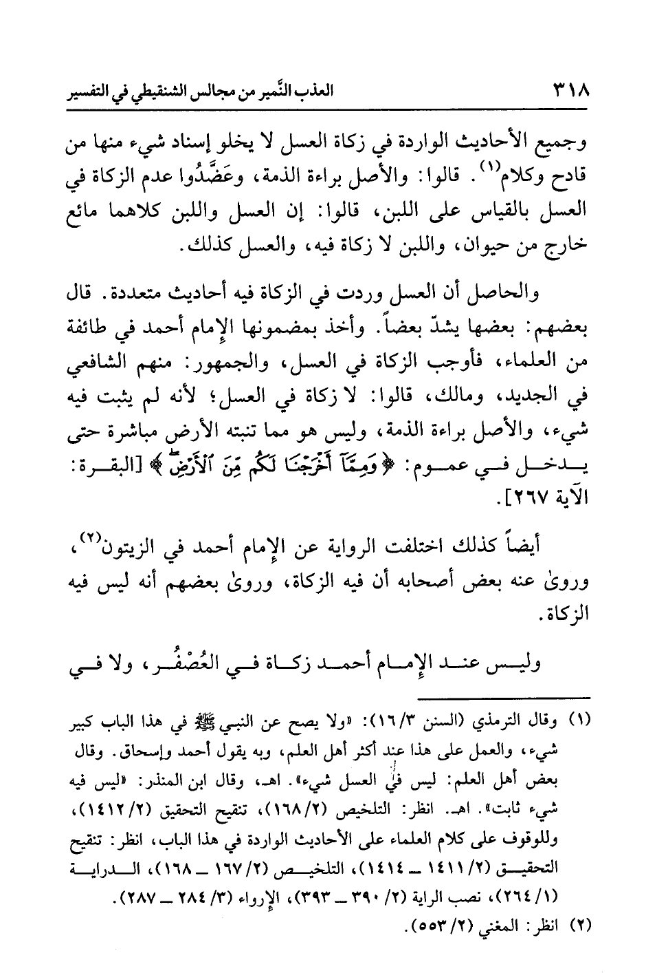 والحاصِل أن العسل وردت في الزكاة فيه أحاديث متعددة. قال بعضهم: بعضها يشدّ بعضًا. وأخذ بمضمونها الإمام أحمد في طائفة من العلماء، فأوجب الزكاة في العسل، والجمهور: منهم الشافعي في الجديد، ومالك، قالوا: لا زكاة في العسل؛ لأنه لم يثبت فيه شيء، والأصل براءة الذمة، وليس هو مما تنبته الأرض مباشرة حتى يدخل في عموم: {وَمِمَّا أَخْرَجْنَا لَكُم مِّنَ الأَرْضِ} [البقرة: الآية 267].