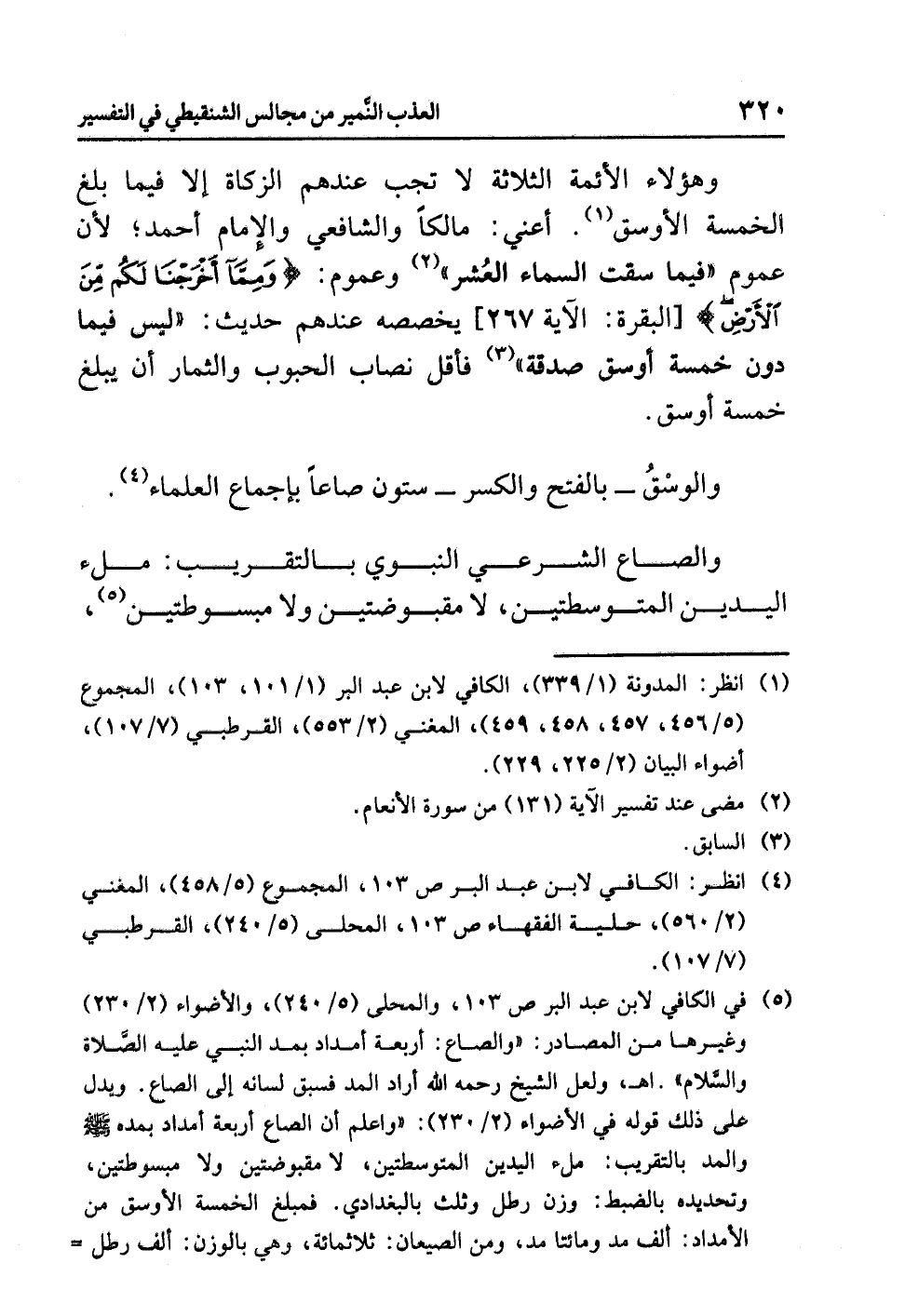 (¬5) في الكافي لابن عبد البر ص 103، والمحلى (5/ 240)، والأضواء (2/ 230) وغيرها من المصادر: «والصاع: أربعة أمداد بمد النبي عليه الصلاة والسلام» اهـ. ولعل الشيخ رحمه الله أراد المد فسبق لسانه إلى الصاع. ويدل على ذلك قوله في الأضواء (2/ 230): «واعلم أن الصاع أربعة أمداد بمده - صلى الله عليه وسلم - والمد بالتقريب: ملء اليدين المتوسطتين، لا مقبوضتين ولا مبسوطتين، وتحديده بالضبط: وزن رطل وثلث بالبغدادي. فمبلغ الخمسة الأوسق من الأمدد: ألف مد ومائتا مد، ومن الصيعان: ثلاثمائة، وهي بالوزن: ألف رطل وستمائة رطل. والرطل: وزن مائة وثمانية وعشرين درهمًا مكيًّا، وزاد بعض أهل العلم: أربعة أسباع درهم، كل درهم وزن خَمْسِين وخُمُسَي حبة من مطلق الشعير ... » اهـ.