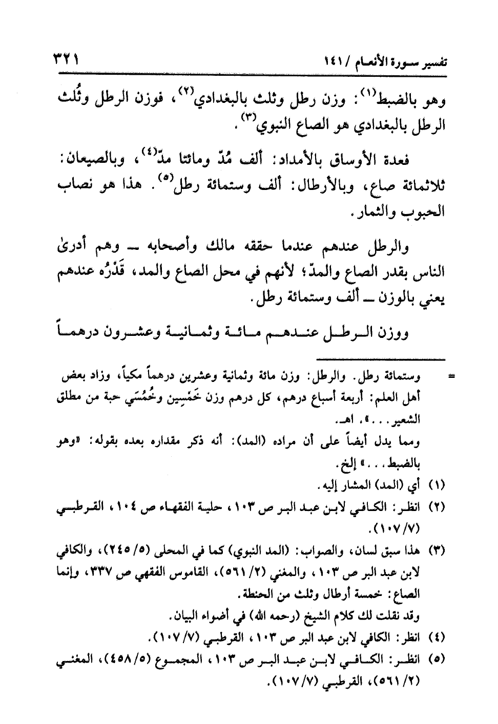 (¬3) هذا سبق لسان، والصواب: (المد النبوي) كما في المحلى (5/ 245)، والكافي لابن عبد البر (ص 103)، والمغني (2/ 561)، القاموس الفقهي (ص 337). وإنما الصاع: خمسة أرطال وثلث من الحنطة.