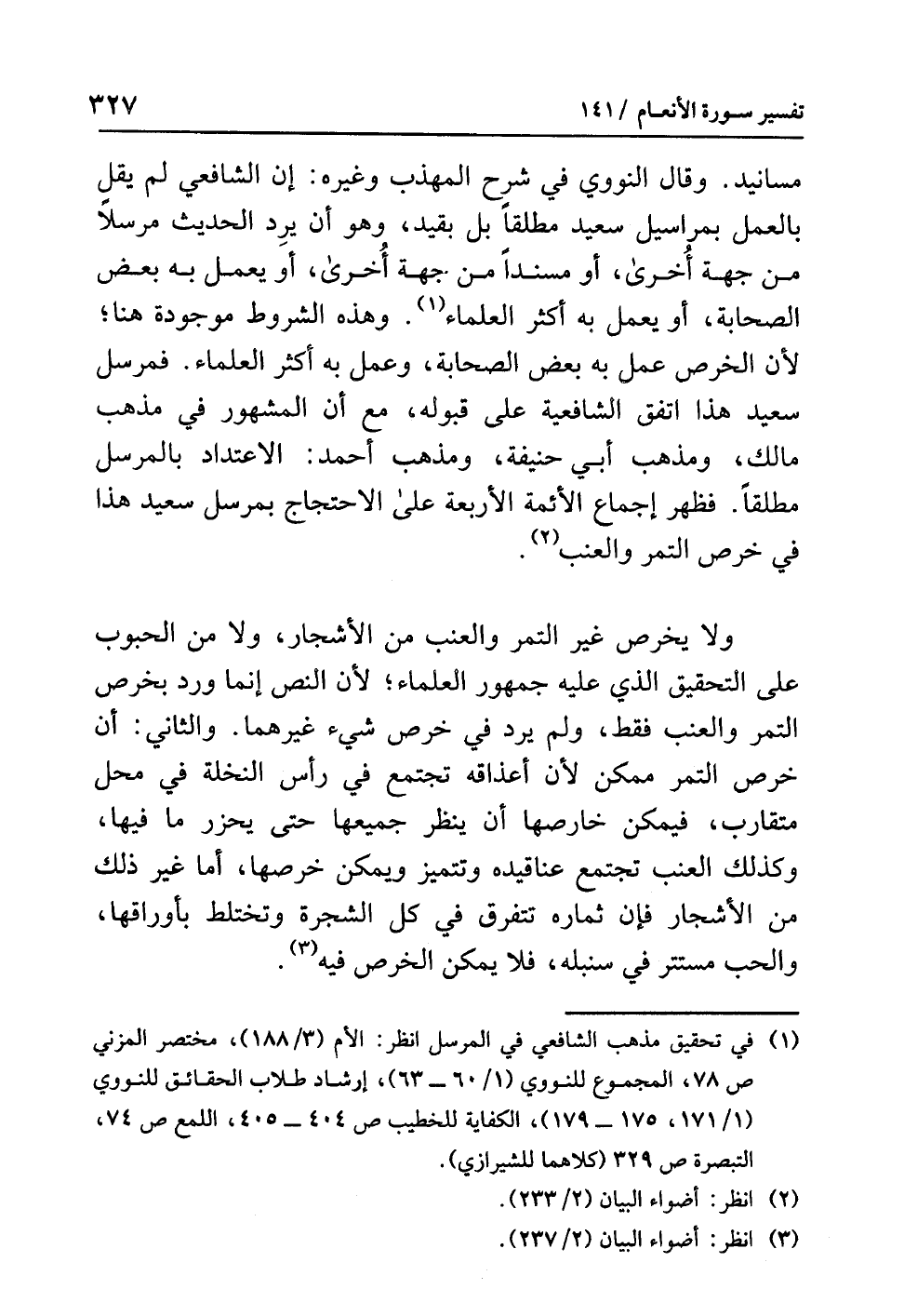 وقال النووي في شرح المهذب وغيره: إن الشافعي لم يَقُلْ بالعمل بمراسيل سعيد مطلقاً بل بِقَيْدٍ، وهو أن يرِد الحديث مرسلًا من جهة أُخْرَى، أو مسنداً من جهة أخرى، أو يعمل به بعض الصحابة، أو يعمل به أكثر العلماء (¬1). وهذه الشروط موجودة هنا؛ لأن الخرص عمل به بعض الصحابة، وعمل به أكثر العلماء، فمرسل سعيد هذا اتفق الشافعية على قبوله، مع أن المشهور في مذهب مالك ومذهب أبي حنيفة ومذهب أحمد: الاعتداد بالمرسل مطلقاً، فظهر إجماع الأئمة الأربعة على الاحتجاج بمرسل سعيد هذا في خرص التمر والعنب (¬2).