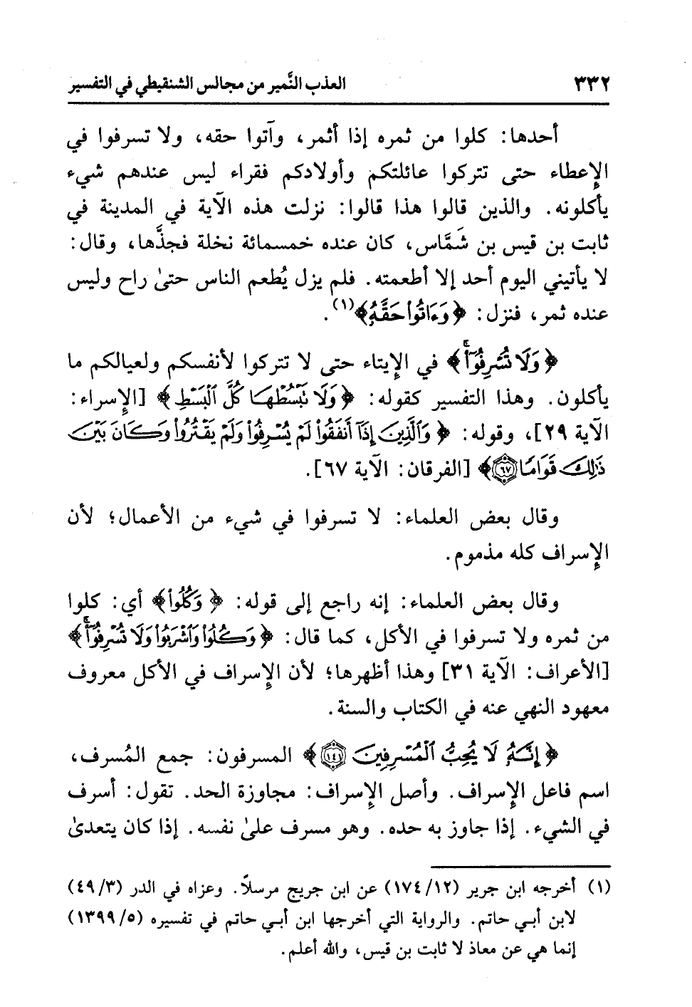 {وَلاَ تُسْرِفُواْ} في الإيتاء حتى لا تتركوا لأنفسكم ولعيالكم ما يأكلون، وهذا التفسير كقوله: {وَلاَ تَبْسُطْهَا كُلَّ الْبَسْطِ} [الإسراء: الآية 29]، وقوله: {وَالَّذِينَ إِذَا أَنفَقُوا لَمْ يُسْرِفُوا وَلَمْ يَقْتُرُوا وَكَانَ بَيْنَ ذَلِكَ قَوَاماً} [الفرقان: الآية 67].