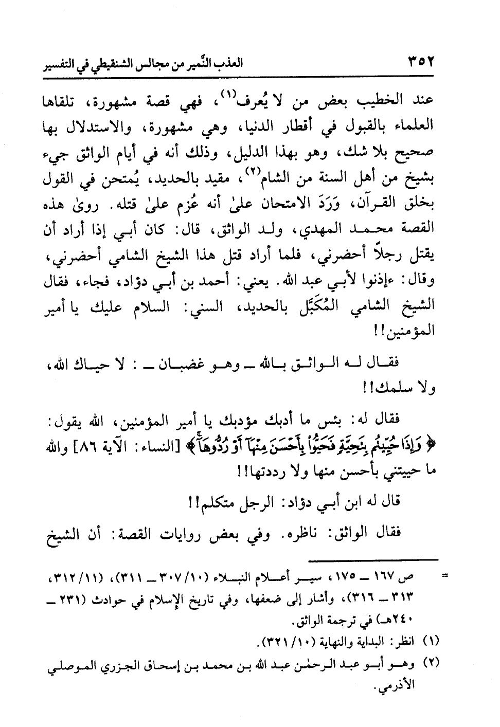 عند الخطيب بعض من لا يُعرف (¬1)، فهي قصة مشهورة، تلقاها العلماء بالقبول في أقطار الدنيا، وهي مشهورة، والاستدلال بها صحيح بلا شك، وهو بهذا الدليل، وذلك أنه في أيام الواثق جيء بشيخ من أهل السنة من الشام (¬2)، مقيد بالحديد، يُمتحن في القول بخلق القرآن، وَرَدَ الامتحان على أنه عُزم على قتله. روى هذه القصة محمد المهدي ولد الواثق، قال: كان أبي إذا أراد أن يقتل رجلاً أحضرني، فلما أراد قتل هذا الشيخ الشَّامِي أحْضَرَنِي، وقال: ائذنوا لأبي عبد الله. يعني: أحمد بن أبي دؤاد، فجاء، فقال الشيخ الشامي المُكَبَّل بالحديد، السني: السلام عليك يا أمير المؤمنين!!