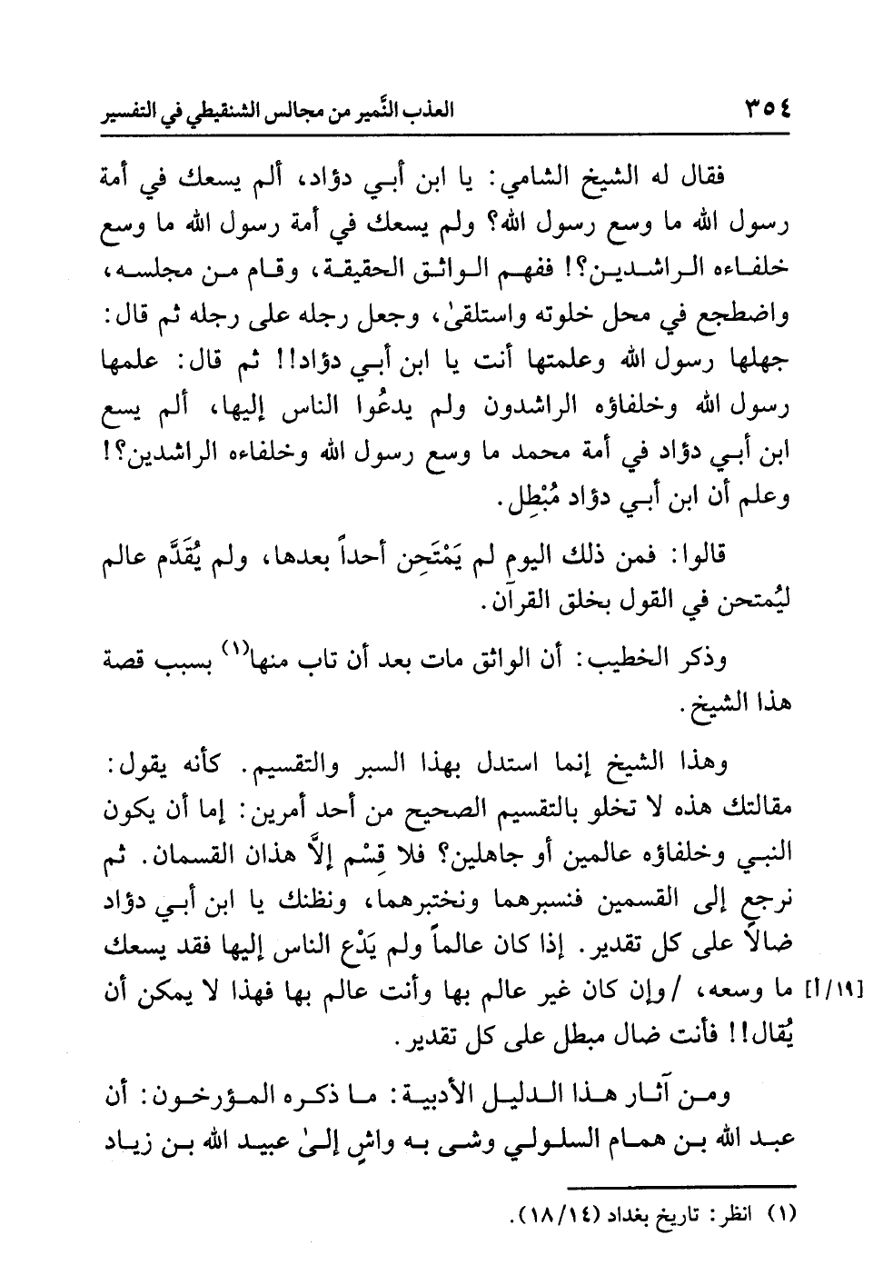 وهذا الشيخ إنما استدل بهذا السبر والتقسيم، كأنه يقول: مقالتك هذه لا تخلو بالتقسيم الصحيح من أحد أمرين: إما أن يكون النبي وخلفاؤه عالمين أو جاهلين؟ فلا قِسْم إلاَّ هذان القسمان، ثم نرجع إلى القسمين فنسبرهما ونختبرهما، ونظنك يا ابن أبي دؤاد ضالّاً على كل [19/أ] تقدير، إذا كان عالماً ولم يَدْع الناس إليها فقد يسعك ما وسعه،/وإن كان غير عالم بها وأنت عالم بها فهذا لا يمكن أن يُقال! فأنت ضال مبطل على كل تقدير.