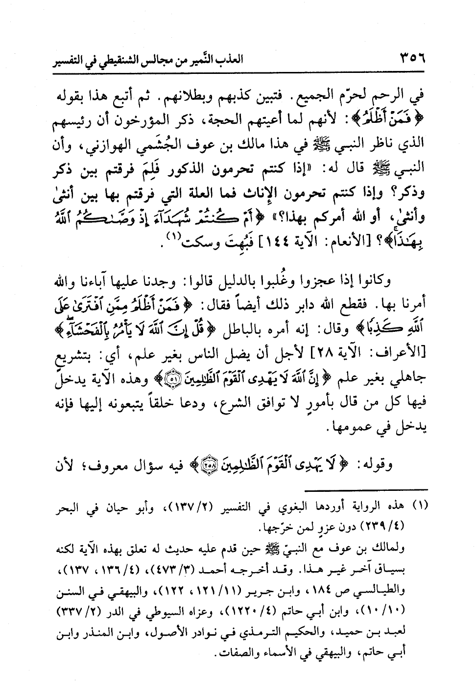 في الرحم لحرّم الجميع، فتبين كذبهم وبطلانهم، ثم أتبع هذا بقوله: {فَمَنْ أَظْلَمُ}؛ لأنهم لما أعيتهم الحجة، ذكر المؤرخون أن رئيسهم الذي ناظر النبي - صلى الله عليه وسلم - في هذا مالك بن عوف الجُشَمي الهوازني، وأن النبي - صلى الله عليه وسلم - قال له: «إذا كنتم تحرمون الذكور فَلِمَ فرقتم بين ذَكَرٍ وذَكَرٍ؟ وإذا كنتم تحرِّمون الإناث فما العِلَّة التي فَرَّقْتُمْ بِهَا بَيْنَ أنْثَى وأُنْثَى، أو الله أمَرَكُمْ بهذا؟» {أَمْ كُنتُمْ شُهَدَاء إِذْ وَصَّاكُمُ اللهُ بِهَذَا} [الأنعام: الآية 144] فَبُهِتَ وسكت (¬1).