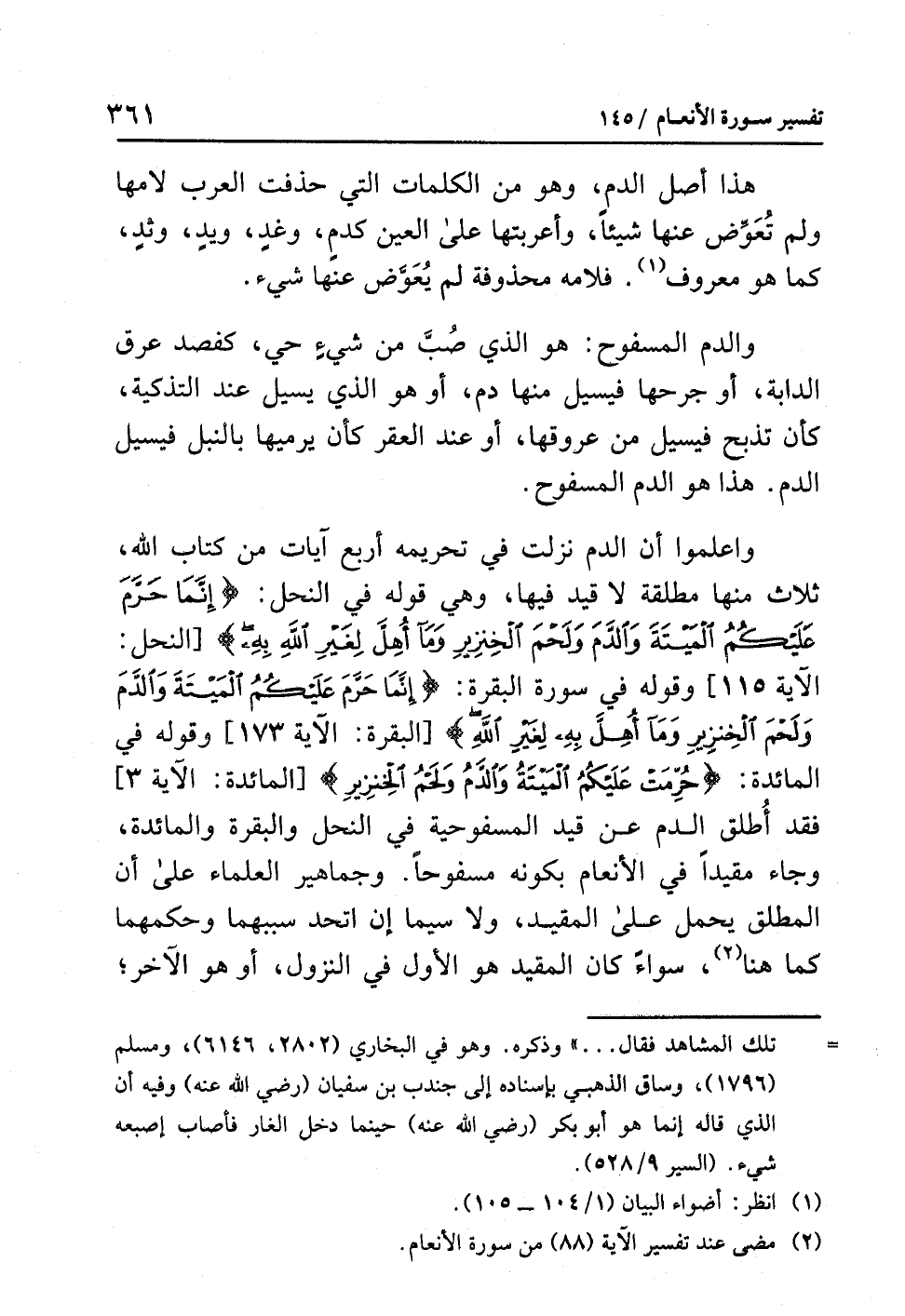 واعلموا أن الدم نزلت في تحريمِهِ أرْبَعُ آيَاتٍ من كتاب الله، ثلاث منها مطلقة لا قيد فيها، وهي قوله في النحل: {إِنَّمَا حَرَّمَ عَلَيْكُمُ المَيْتَةَ وَالْدَّمَ وَلَحْمَ الْخَنزِيرِ وَمَا أُهِلَّ لِغَيْرِ اللهِ بِهِ} [النحل: الآية 115]، وقوله في سورة البقرة: {إِنَّمَا حَرَّمَ عَلَيْكُمُ المَيْتَةَ وَالدَّمَ وَلَحْمَ الْخِنزِيرِ وَمَا أُهِلَّ بِهِ لِغَيْرِ اللهِ} [البقرة: الآية 173] وقوله في المائدة: {حُرِّمَتْ عَلَيْكُمُ المَيْتَةُ وَالْدَّمُ وَلَحْمُ الْخِنْزِيرِ} [المائدة: الآية 3] فقد أُطلق الدم عن قيد المسفوحية في النحل والبقرة والمائدة، وجاء مقيداً في الأنعام بكونه مسفوحاً، وجماهير العلماء على أن المطلق يحمل على المقيد، ولا سيما إن اتَّحَد سَبَبُهما وحكمهما كما هنا (¬2)، سواءً كان المقيد هو الأول في النزول، أو هو الآخر؛