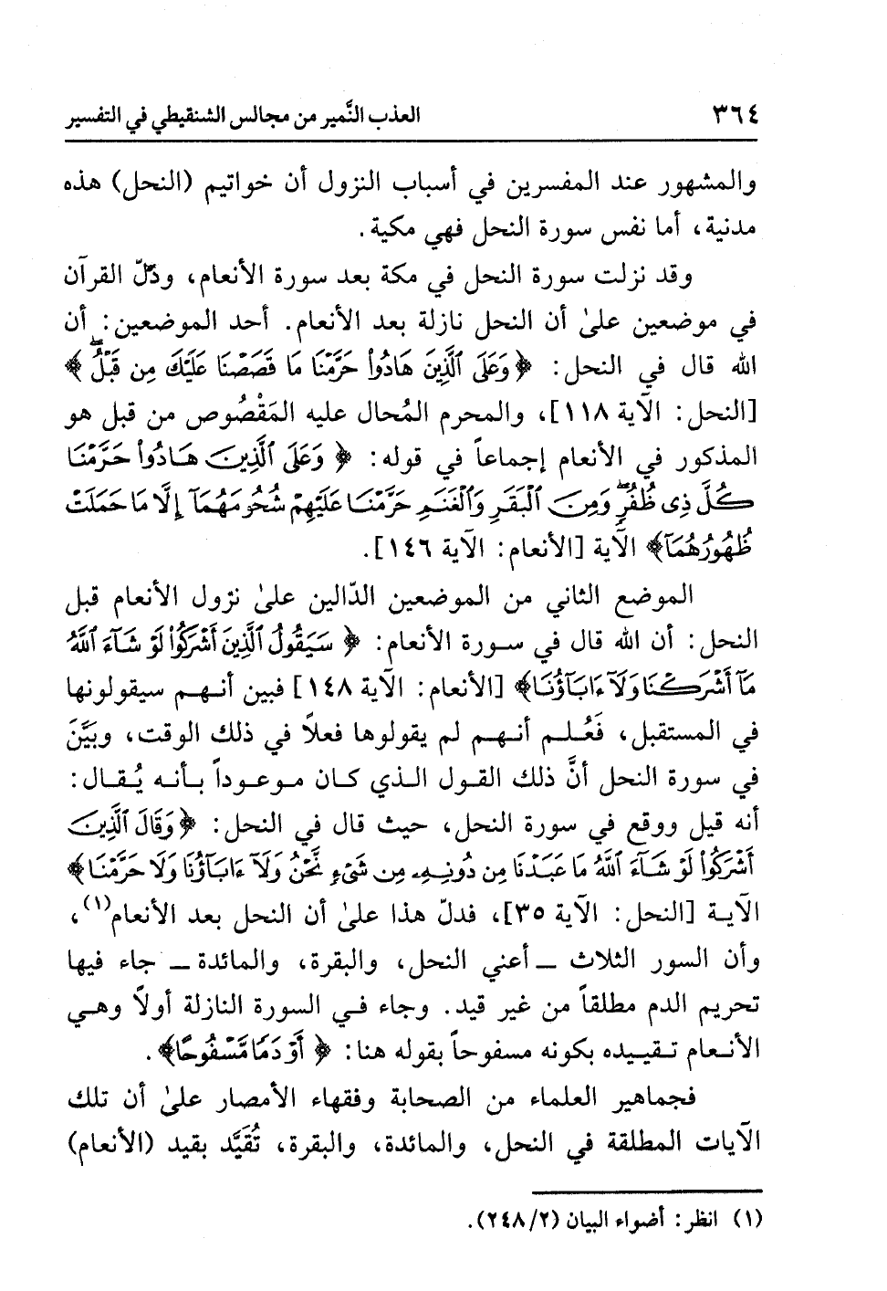 وقد نزلت سورة النحل في مكة بعد سورة الأنعام، ودلّ القرآن في موضعين على أن النحل نازلة بعد الأنعام، أحد الموضعين: أن الله قال في النحل: {وَعَلَى الَّذِينَ هَادُواْ حَرَّمْنَا مَا قَصَصْنَا عَلَيْكَ مِن قَبْلُ} [النحل: الآية 118]، والمحرم المُحال عليه المَقْصُوص من قبل هو المذكور في الأنْعَامِ إِجْمَاعاً في قوله: {وَعَلَى الَّذِينَ هَادُواْ حَرَّمْنَا كُلَّ ذِي ظُفُرٍ وَمِنَ الْبَقَرِ وَالْغَنَمِ حَرَّمْنَا عَلَيْهِمْ شُحُومَهُمَا إِلَّا مَا حَمَلَتْ ظُهُورُهُمَا} الآية [الأنعام: الآية 146].