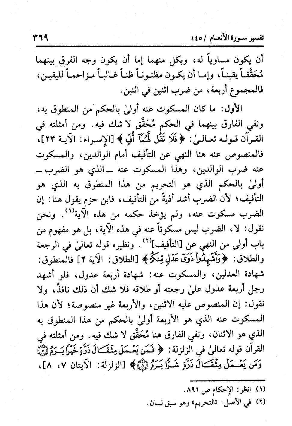 الأول: ما كان المسكوت عنه أولى بالحكم من المنطوق به، ونفي الفارق بينهما في الحكم مُحَقَّق لا شك فيه. ومن أمثلته في القرآن قوله تعالى: {فَلاَ تَقُل لَّهُمَا أُفٍّ} [الإسراء: الآية 23]، فالمنصوص عنه هنا النهي عن التأفيف أمام الوالدين، والمسكوت عنه ضرب الوالدين، وهذا المسكوت عنه- الذي هو الضرب- أولى بالحكم الذي هو التحريم من هذا المنطوق به الذي هو التأفيف؛ لأن الضرب أشد أذيةً من التأفيف، فابن حزم يقول هنا: إن الضرب مسكوت عنه، ولم يؤخذ حكمه من هذه الآية (¬1). ونحن نقول: لا، الضرب ليس مسكوتاً عنه في هذه الآية، بل هو مفهوم من باب أولى من النهي عن [التأفيف] (¬2).