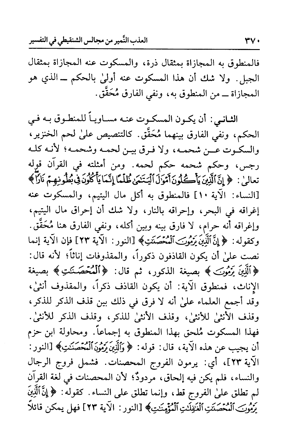وكقوله: {إِنَّ الَّذِينَ يَرْمُونَ المُحْصَنَاتِ} [النور: الآية 23] فإن الآية إنما نَصَّتْ عَلَى أن يكون القاذِفُونَ ذكوراً، والمقذوفات إناثاً؛ لأنه قال: {الَّذِينَ يَرْمُونَ} بصيغة الذكور، ثم قال: {المُحْصَنَاتِ} بصيغة الإناث، فمنطوق الآية: أن يكون القاذف ذكراً، والمقذوف أنثى، وقد أجمع العلماء على أنه لا فرق في ذلك بين قذف الذكر للذكر، وقذف الأنثى للأنثى، وقذف الأنثى للذكر، وقذف الذكر للأنثى، فهذا المسكوت مُلْحَقٌ بهذا المنطوق به إجماعاً، ومحاولة ابن حزم أن يجيب عن هذه الآية، قال: قوله: {وَالَّذِينَ يَرْمُونَ المُحْصَنَاتِ} [النور: الآية 23]، أي: يرمون الفروج المحصنات، فشمل فروج الرجال والنساء، فلم يكن فيه إلحاق، مردودٌ؛ لأن المحصنات في لغة القرآن لم تطلق على الفروج قط، وإنما تطلق على النساء، كقوله: {إِنَّ الَّذِينَ يَرْمُونَ المُحْصَنَاتِ الْغَافِلَاتِ المُؤْمِنَاتِ} [النور: الآية 23] فهل يمكن قائلاً