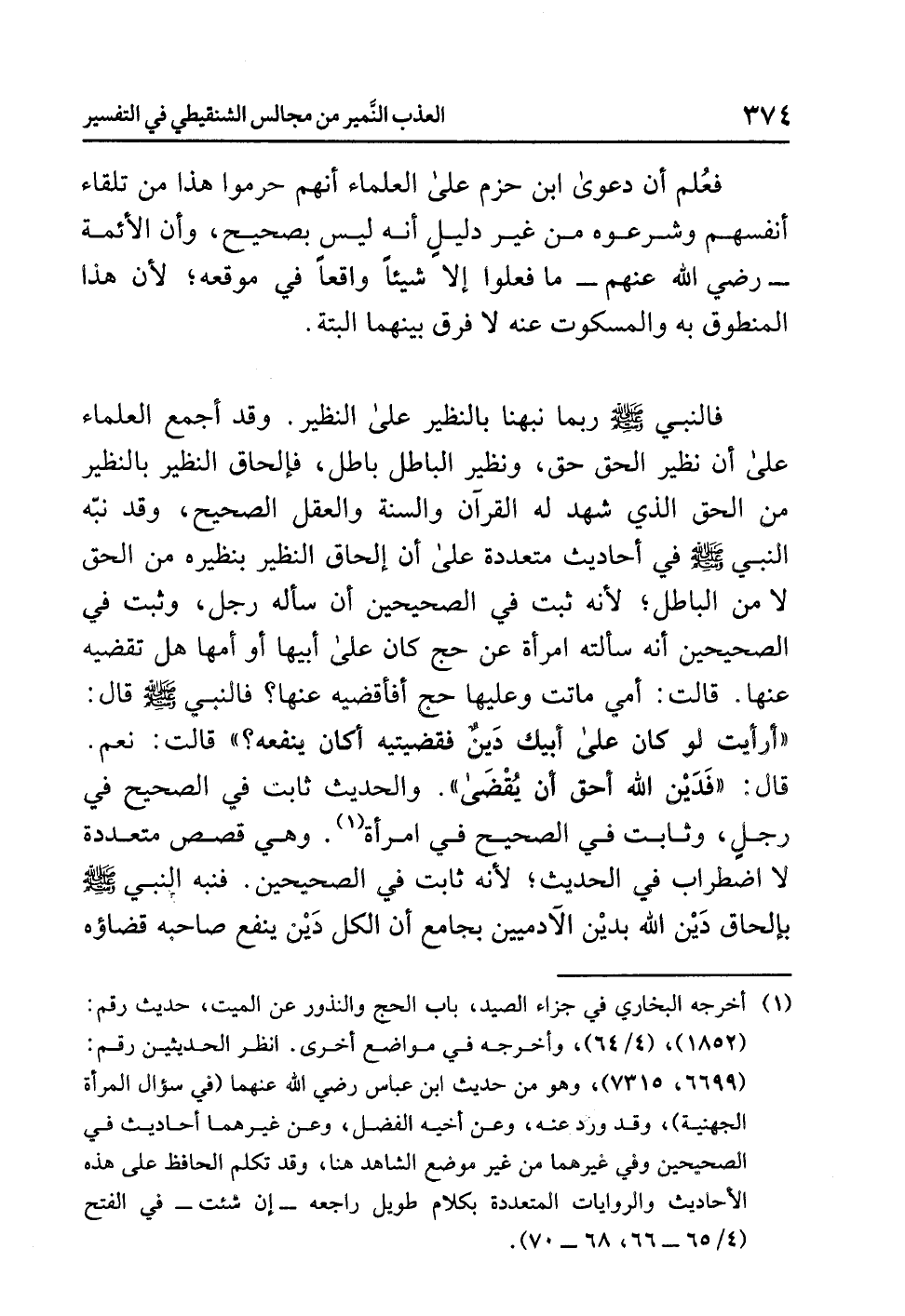 فالنبي - صلى الله عليه وسلم - ربما نَبَّهَنَا بِالنَّظِيرِ عَلَى النَّظِيرِ، وقد أجمع العلماء على أن نَظِيرَ الحق حق، ونظير الباطل باطل، فإِلحَاقُ النَّظِيرِ بالنَّظِير من الحق الذي شهد له القرآن والسنة والعقل الصحيح، وقد نبَّه النبي - صلى الله عليه وسلم - في أحاديث مُتَعَدِّدَة على أن إلحاق النظير بنظيره من الحق لا مِنَ البَاطِلِ؛ لأنه ثبت في الصحيحين أن سأله رجل، وثبت في الصحيحين أنه سألته امرأة عن حج كان على أبيها أو أمها هل تقضيه عنها؟ قالت: أمي ماتت وعليها حج أفأقضيه عنها؟ فالنبي - صلى الله عليه وسلم - قال: «أَرَأَيْتِ لَوْ كَانَ عَلَى أَبِيكِ دَيْنٌ فَقَضَيْتِيهِ أَكَانَ يَنْفَعُهُ؟» قالت: نعم. قال: «فَدَيْنُ اللهِ أحَقُّ أَنْ يُقْضَى» والحديث ثابت في الصحيح في رجل، وثابت في الصحيح في امرأة (¬1)، وهي قصص متعددة لا اضطراب في الحديث؛ لأنه ثابت في الصحيحين، فنبه النبي - صلى الله عليه وسلم - بإلحاق دَيْن الله بدَيْن الآدميين بجامع أن الكل دَيْن ينفع صاحبه قضاؤه