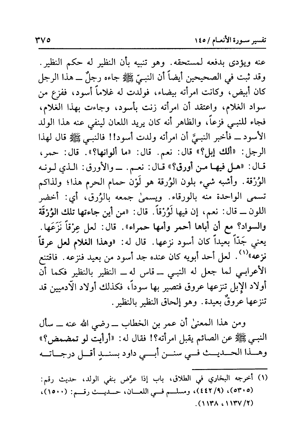 (¬1) أخرجه البخاري في الطلاق، باب إذا عرَّض بنفي الولد، حديث رقم: (5305)، (9/ 442)، ومسلم في اللعان، حديث رقم: (1500)، (2/ 1137، 1138).