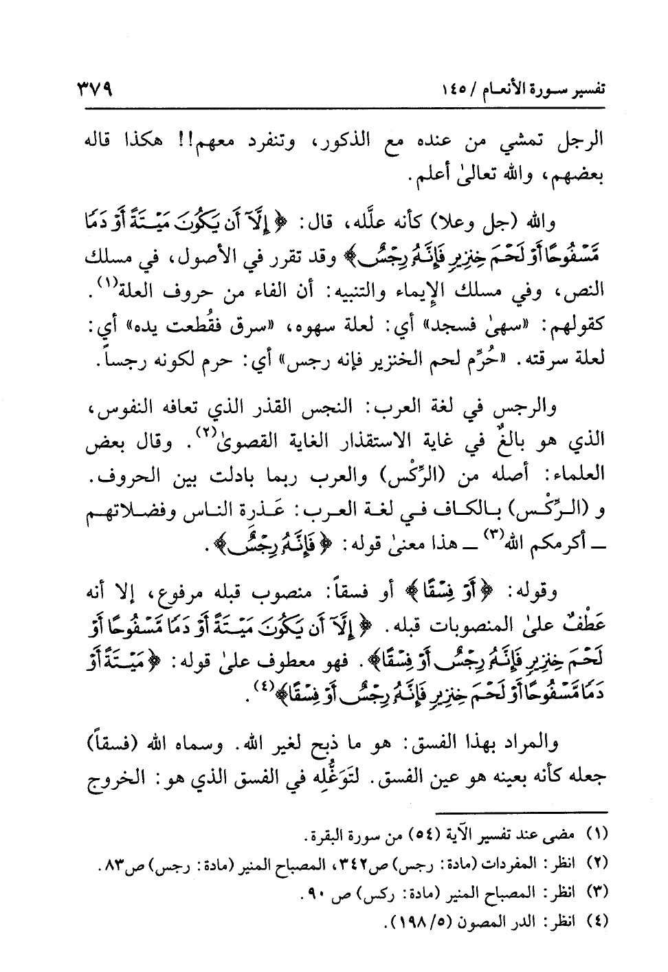 والله (جل وعلا) كأنه علَّله، قال: {إِلَّا أَن يَكُونَ مَيْتَةً أَوْ دَماً مَّسْفُوحاً أَوْ لَحْمَ خِنزِيرٍ فَإِنَّهُ رِجْسٌ} وقَدْ تَقَرَّر في الأصول، في مَسْلَكِ النص وفي مسلك الإيماء والتنبيه: أن الفاء من حروف العلة (¬1)، كقولهم: «سَهَا فسجد» أي: لِعِلَّةِ سَهْوِهِ، «سرق فقُطعت يده» أي: لعلة سَرِقَتِهِ، «حُرِّم لحم الخنزير فإنه رجس» أي: حرم لكونه رجساً.
