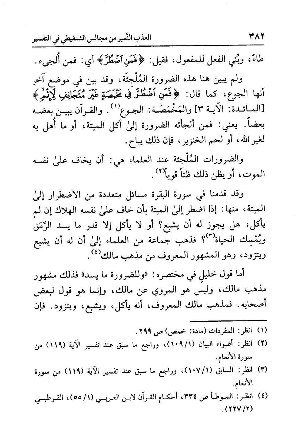 وقد قدمنا في سورة البقرة مسائل متعددة من الاضطرار إلى الميتة، منها: إذا اضطر إلى الميتة بأن خاف على نفسه الهَلَاك إن لم يأكل، هل يجوز له أن يشبع؟ أو لا يأكل إلا قدر ما يَسُد الرَّمَق ويُمْسِك الحياة؟ (¬3) فذهب جماعة من العلماء إلى أن له أن يشبع ويتزود، وهو المشهور المعروف من مذهب مالك (¬4).