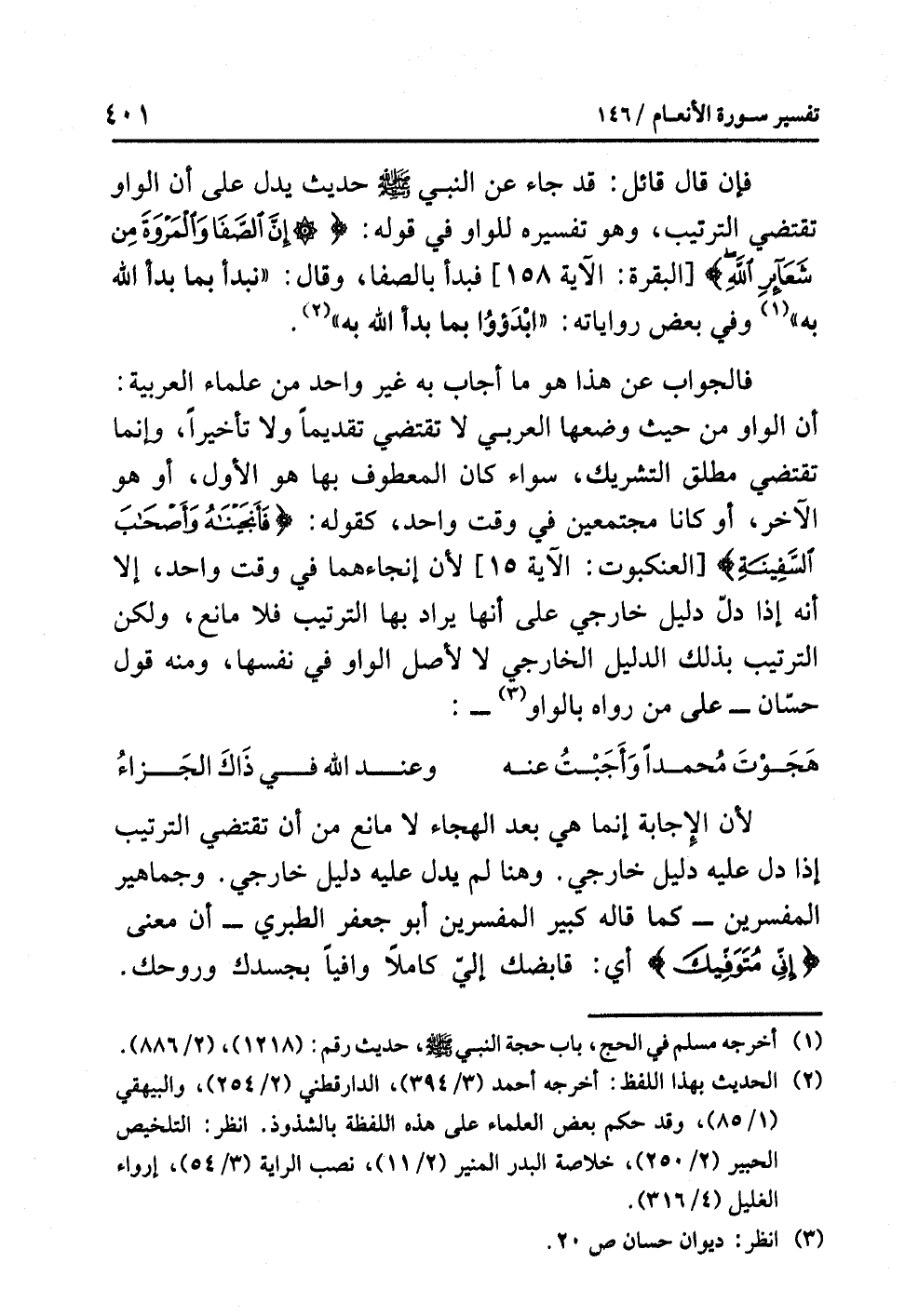 فالجواب عن هذا هو ما أجاب به غير واحد من علماء العربية: أن الواو من حيث وضعها العربي لا تقتضي تقديماً ولا تأخيراً، وإنما تقتضي مطلق التشريك، سواء كان المعطوف بها هو الأول أو هو الآخر، أو كانا مجتمعين في وقت واحد، كقوله: {فَأَنجَيْنَاهُ وَأَصْحَابَ السَّفِينَةِ} [العنكبوت: الآية 15] لأن إنجاءهما في وقت واحد، إلا أنه إذا دلّ دليل خارجي على أنها يراد بها الترتيب فلا مانع، ولكن الترتيب بذلك الدليل الخارجي لا لأصل الواو في نفسها، ومنه قول حسّان، على من رواه بالواو (¬3):