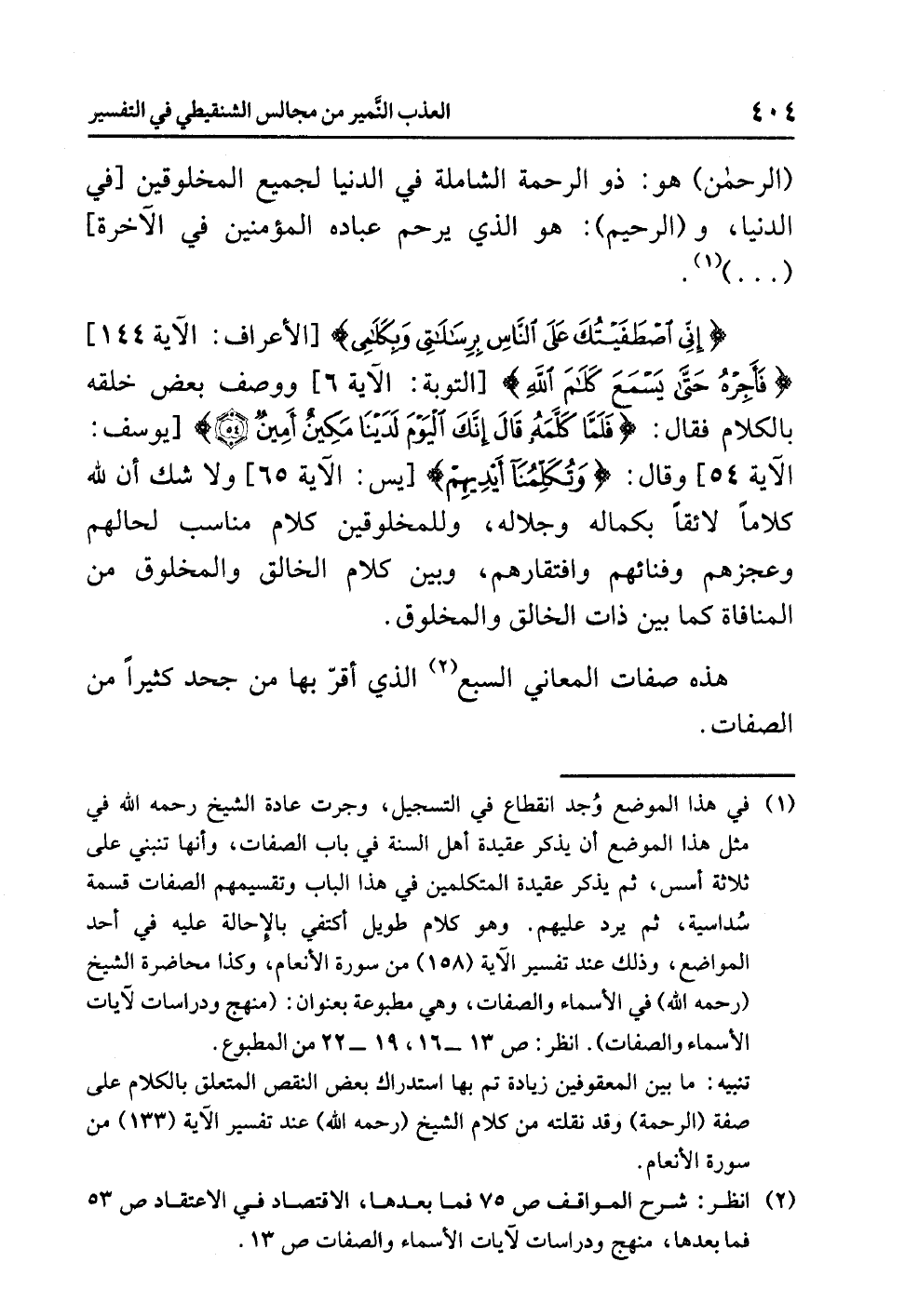 (¬1) في هذا الموضع وُجد انقطاع في التسجيل، وجرت عادة الشيخ رحمه الله في مثل هذا الموضع أن يذكر عقيدة أهل السنة في باب الصفات، وأنها تنبني على ثلاثة أسس، ثم يذكر عقيدة المُتَكَلِّمِينَ في هذا الباب وتقسيمهم الصفات قسمة سُداسية، ثم يرد عليهم، وهو كلام طويل أكتفي بالإحالة عليه في أحد المواضع، وذلك عند تفسير الآية (158) من سورة الأنعام، وكذا محاضرة الشيخ (رحمه الله) في الأسماء والصفات، وهي مطبوعة بعنوان: (منهج ودراسات لآيات الأسماء والصفات). انظر ص 13 - 16، 19 - 22 من المطبوع.