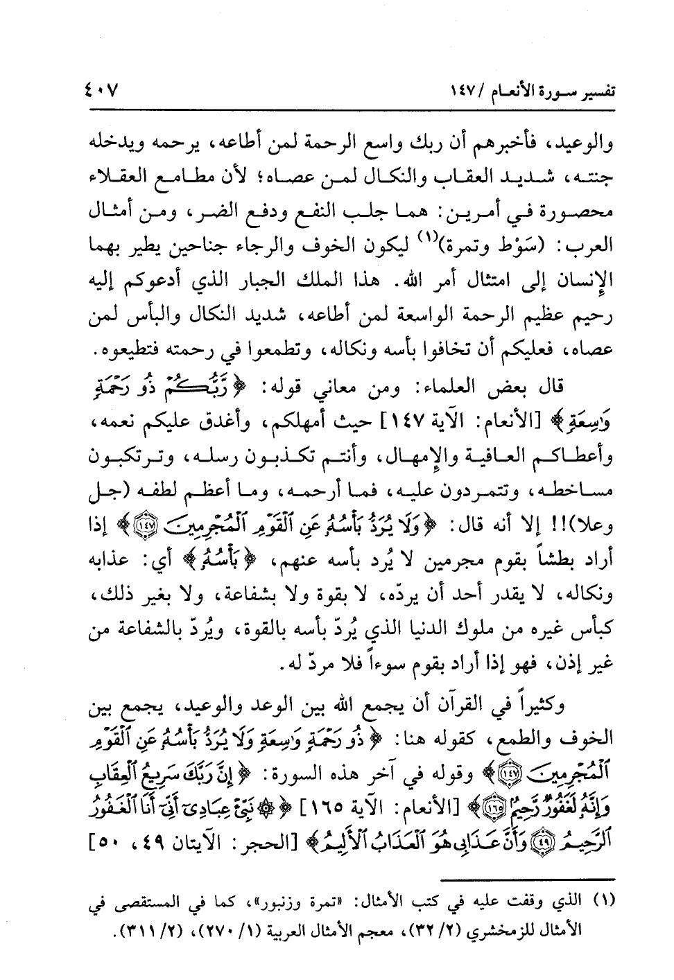 وكثيراً في القرآن أن يجمع اللهُ بَيْنَ الْوَعْدِ والوَعِيدِ، يَجْمَعُ بَيْنَ الخَوْفِ والطَّمَعِ، كقوله هنا: {ذُو رَحْمَةٍ وَاسِعَةٍ وَلاَ يُرَدُّ بَأْسُهُ عَنِ الْقَوْمِ المُجْرِمِينَ} وقوله في آخر هذه السورة: {إِنَّ رَبَّكَ سَرِيعُ الْعِقَابِ وَإِنَّهُ لَغَفُورٌ رَّحِيمٌ} [الأنعام: الآية 165]، {نَبِّئْ عِبَادِي أَنِّي أَنَا الْغَفُورُ الرَّحِيمُ (49) وَأَنَّ عَذَابِي هُوَ الْعَذَابُ الأَلِيمَ (50)} [الحجر: الآيتان 49، 50]
