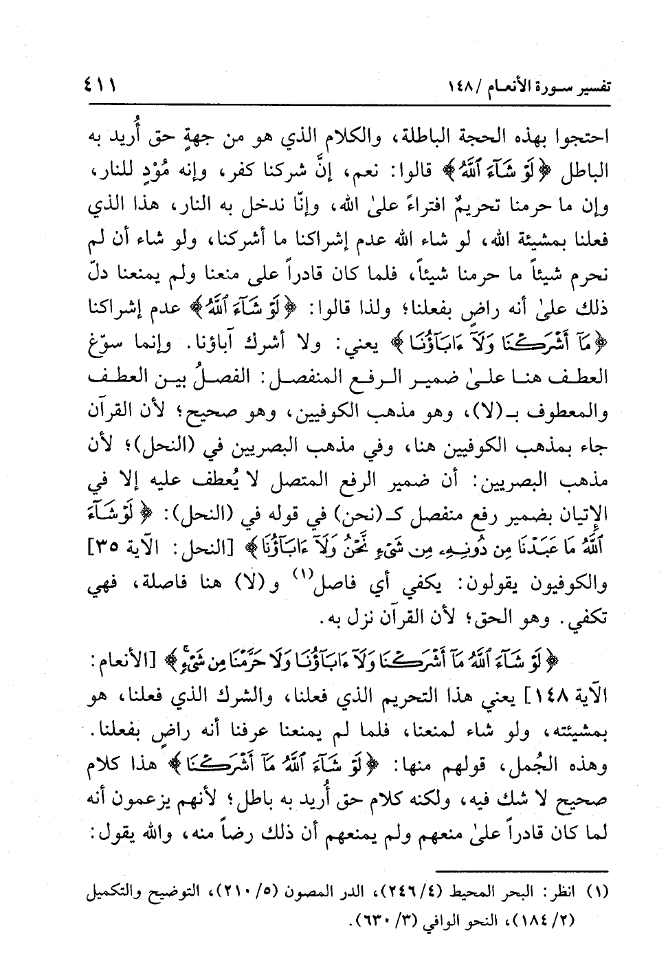 احتجوا بهذه الحجة الباطلة، والكلام الذي هو من جهة حق أُريد به الباطل {لَوْ شَاء اللهُ} قالوا: نعم، إنّ شِرْكَنَا كُفْرٌ، وأنه مودي للنار، وإن ما حرمنا تحريمٌ افتراءٌ على الله، وأنَّا ندخل به النار، هذا الذي فعلنا بمشيئة الله، لو شاء الله عدم إشراكنا ما أشْرَكْنَا، ولو شاء أنْ لم نُحَرِّمْ شيئاً ما حرَّمْنَا شيئاً، فلما كان قادراً على مَنْعِنَا ولم يمنعنا دلّ ذلك على أنه راضٍ بفعلنا؛ ولذا قالوا: {لَوْ شَاء اللهُ} عدم إشراكنا {مَا أَشْرَكْنَا وَلاَ آبَاؤُنَا} يعني: ولا أشرك آباؤنا، وإنَّمَا سَوَّغَ العطف هنا على ضمير الرفع المنفصل: الفصلُ بين العطف والمعطوف بـ (لا)، وهو مذهب الكوفيين، وهو صحيح؛ لأن القرآن جاء بمذهب الكوفيين هُنَا، وفي مذهب البصريين في (النحل)؛ لأن مذهب البصريين: أنَّ ضَمِيرَ الرفع المتصل لا يُعطف عليه إلا في الإتيان بضمير رفع منفصل كـ (نحن) في قوله في (النحل): {لَوْ شَاء اللهُ مَا عَبَدْنَا مِن دُونِهِ مِن شَيْءٍ نَّحْنُ وَلا آبَاؤُنَا} [النحل: الآية 35] والكوفيون يقولون: يكفي أي فاصل (¬1)