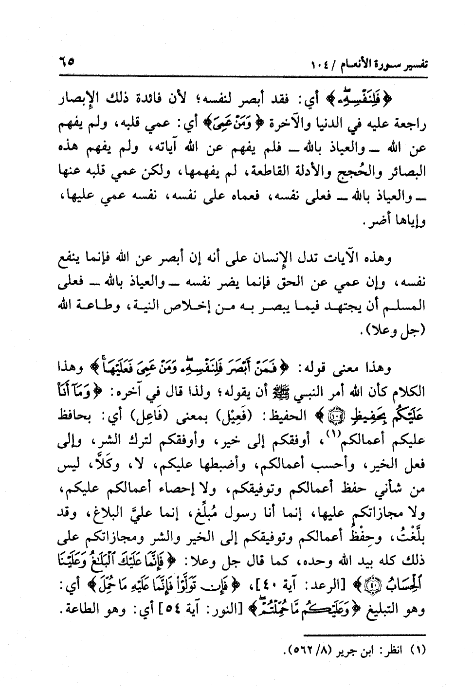 وهذا معنَى قولِه: {فَمَنْ أَبْصَرَ فَلِنَفْسِهِ وَمَنْ عَمِيَ فَعَلَيْهَا} وهذا الكلامُ كَأَنَّ اللَّهَ أَمَرَ النبيَّ - صلى الله عليه وسلم - أن يقولَه، ولذا قال في آخرِه: {وَمَا أَنَا عَلَيْكُم بِحَفِيظٍ (104)} الحفيظُ: (فَعِيْل) بمعنَى (فَاعِل) أي: بحافظٍ عليكم أعمالَكم (¬1)، أُوَفِّقُكُمْ إلى خيرٍ، وأوفقكم لتركِ الشرِّ، وإلى فعلِ الخيرِ، وأحسبُ أعمالَكم، وأضبطُها عليكم، لا، وكَلاَّ، ليس مِنْ شَأْنِي حفظُ أعمالِكم وتوفيقِكم، ولا إحصاءُ أعمالِكم عليكم، ولا مجازاتكم عليها، إنما أنا رسولٌ مُبلِّغٌ، إنما عليَّ البلاغُ، وقد بلَّغْتُ، وحِفْظُ أعمالِكم وتوفيقكم إلى الخيرِ والشرِّ ومجازاتُكم على ذلك كُلِّهِ بيدِ اللَّهِ وحدَه، كما قال جل وعلا: {فَإِنَّمَا عَلَيْكَ الْبَلاَغُ وَعَلَيْنَا الْحِسَابُ (40)} [الرعد: آية 40] {فَإِنْ تَوَلَّوا فَإِنَّمَا عَلَيْهِ مَا حُمِّلَ} أي: وهو التبليغُ {وَعَلَيْكُم مَّا حُمِّلْتُمْ} [النور: آية 54] أي: وهو الطاعةُ.