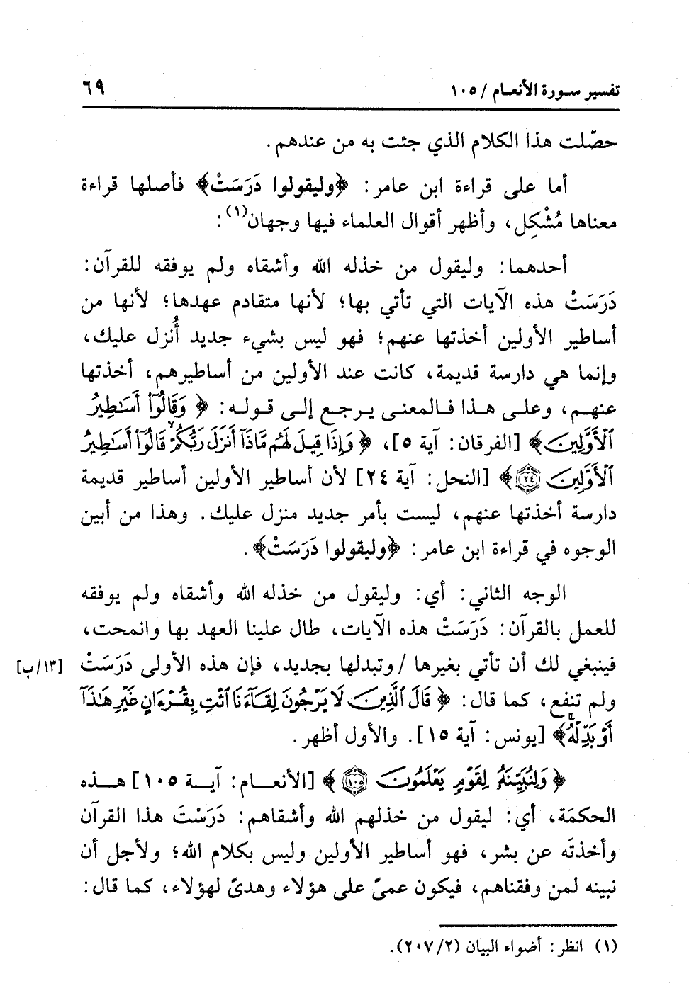 أحدُهما: وليقولَ مَنْ خَذَلَهُ اللَّهُ وأشقاه ولم يُوَفِّقْهُ للقرآنِ: دَرَسَتْ هذه الآياتِ التي تأتي بها؛ لأنها متقادمٌ عَهْدُهَا؛ لأنها من أساطيرِ الأولينَ أخذتَها عنهم؛ فهو ليس بشيءٍ جديدٍ أُنْزِلَ عليكَ، وإنما هي دارسةٌ قديمةٌ، كانت عندَ الأولين من أساطيرِهم، أخذتَها عنهم، وعلى هذا فالمعنَى يرجعُ إلى قولِه: {وَقَالُوا أَسَاطِيرُ الْأَوَّلِينَ} [الفرقان: آية 5] {وَإِذَا قِيلَ لَهُم مَّاذَا أَنْزَلَ رَبُّكُمْ قَالُوا أَسَاطِيرُ الأَوَّلِينَ} [النحل: آية 24] لأَنَّ أساطيرَ الأولينَ أساطيرُ قديمةٌ دارسةٌ أخذتَها عنهم، ليست بأمرٍ جديدٍ مُنَزَّلٍ عليك. وهذا مِنْ أَبْيَنِ الوجوهِ في قراءةِ ابنِ عامرٍ: {وَلِيَقُولُوا دَرَسَتْ}.