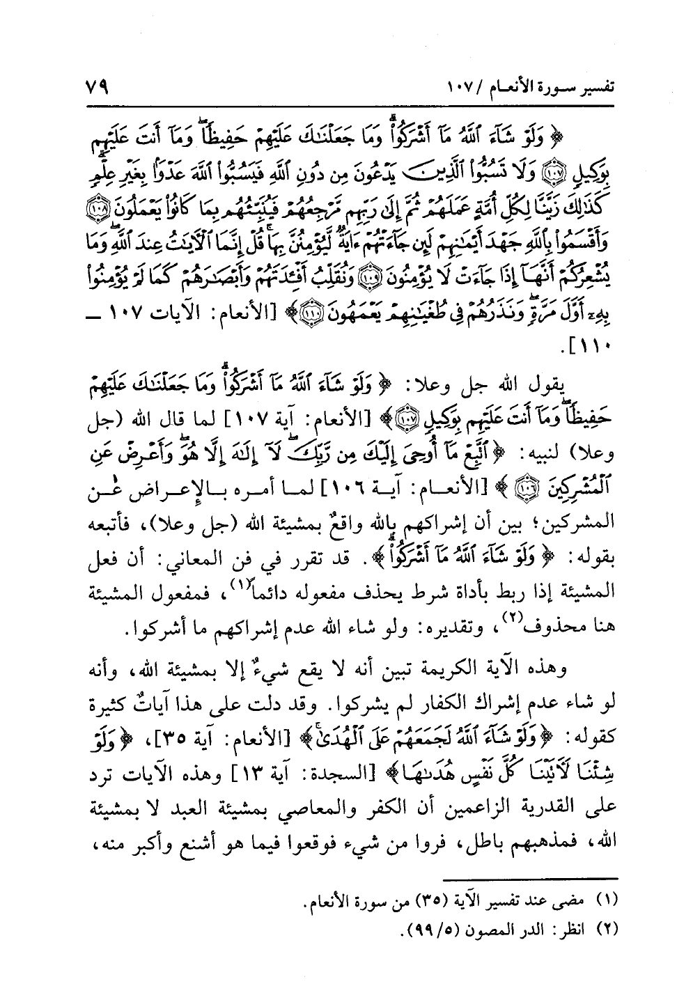 يقول اللَّهُ جل وعلا: {وَلَوْ شَاءَ اللَّهُ مَا أَشْرَكُوا وَمَا جَعَلْنَاكَ عَلَيْهِمْ حَفِيظًا وَمَا أَنتَ عَلَيْهِم بِوَكِيلٍ (107)} [الأنعام: آية 107] لَمَّا قال اللَّهُ (جل وعلا) لِنَبِيِّهِ: {اتَّبِعْ مَا أُوحِيَ إِلَيْكَ مِن رَّبِّكَ لاَ إِلَهَ إِلاَّ هُوَ وَأَعْرِضْ عَنِ الْمُشْرِكِينَ (106)} [الأنعام: آية 106] لَمَّا أمرَه بالإعراضِ عن المشركين بَيَّنَ أَنَّ إشراكَهم بِاللَّهِ واقعٌ بمشيئةِ اللَّهِ (جل وعلا)، وَأَتْبَعَهُ بقولِه: {وَلَوْ شَاءَ اللَّهُ مَا أَشْرَكُوا} قد تقررَ في فَنِّ الْمَعَانِي: أن فعلَ المشيئةِ إذا رُبِطَ بأداةِ شرطِ يُحْذَفُ مفعولُه دائمًا (¬1)، فمفعولُ المشيئةِ هنا مَحْذُوفٌ (¬2)، وتقديرُه: ولو شاءَ اللَّهُ عَدَمَ إشراكِهم ما أَشْرَكُوا.