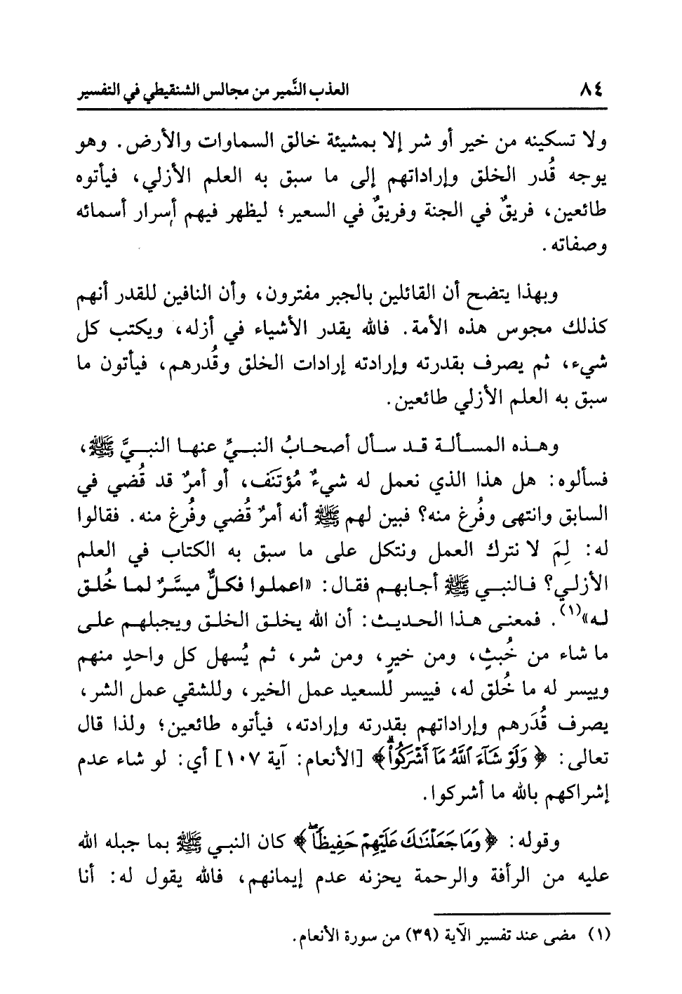 وبهذا يتضحُ أن القائلين بالجبرِ مُفْتَرُونَ، وأن النافينَ للقدرِ أنهم كذلك مَجُوسُ هذه الأمةِ. فَاللَّهُ يُقَدِّرُ الأشياءَ في أَزَلِهِ، ويكتبُ كُلَّ شيءٍ، ثم يصرفُ بقدرتِه وإرادتِه إراداتِ الْخَلْقِ وقُدَرَهُمْ، فيأتونَ ما سَبَقَ به الْعِلْمُ الأَزَلِيُّ طَائِعِينَ.