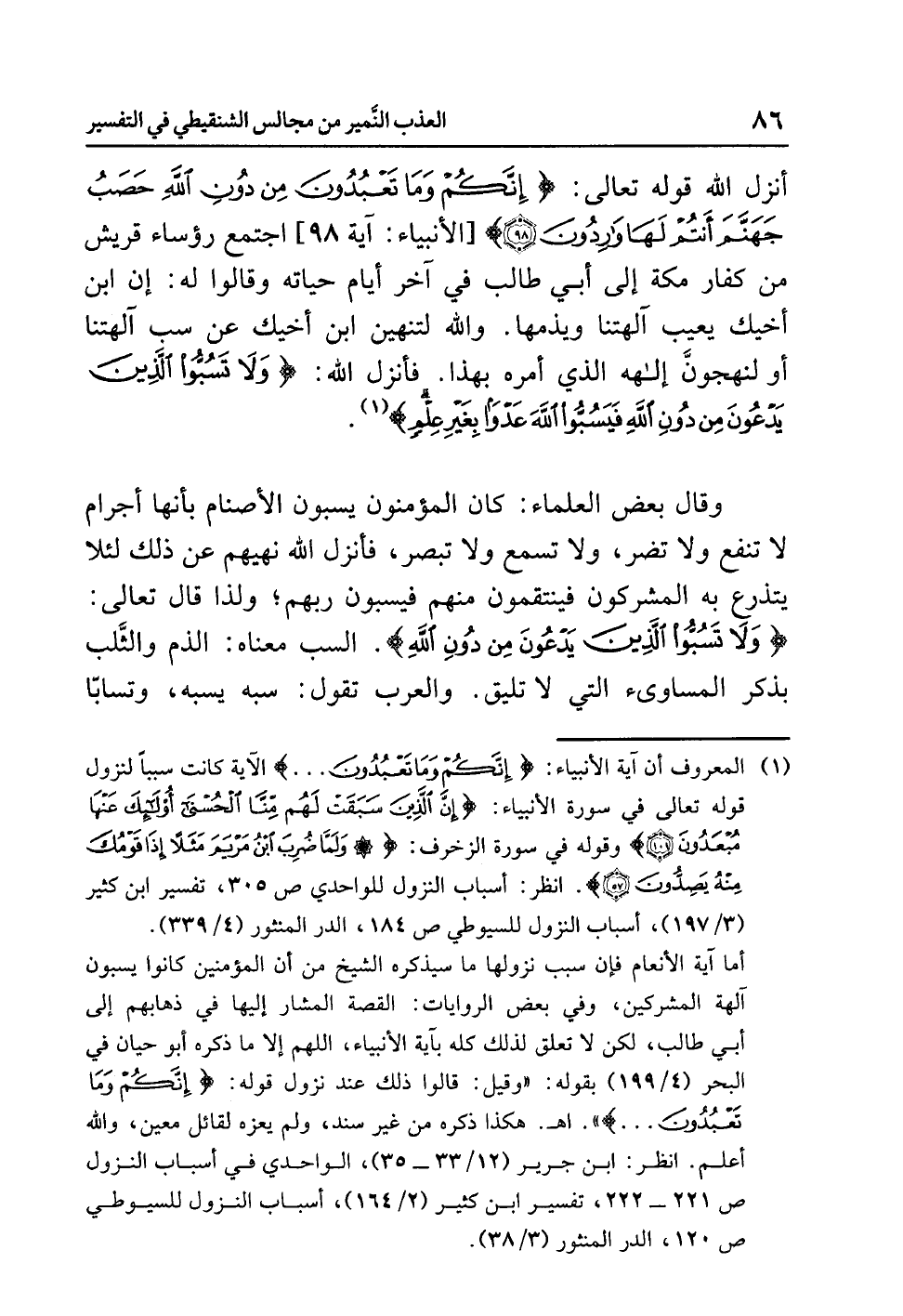 أما آية الأنعام فإن سبب نزولها ما سيذكره الشيخ من أن المؤمنين كانوا يسبون آلهة المشركين، وفي بعض الروايات: القصة المشار إليها في ذهابهم إلى أبي طالب، لكن لا تعلق لذلك كله بآية الأنبياء، اللهم إلا ما ذكره أبو حيان في البحر (4/ 199) بقوله: «وقيل: قالوا ذلك عند نزول قوله: {إِنَّكُمْ وَمَا تَعْبُدُونَ ... }» ا. هـ. هكذا ذكره من غير سند، ولم يعزه لقائل معين. والله أعلم. انظر: ابن جرير (12/ 33 - 35)، الواحدي في أسباب النزول ص 221 - 222، تفسير ابن كثير (2/ 164)، أسباب النزول للسيوطي ص120، الدر المنثور (3/ 38).