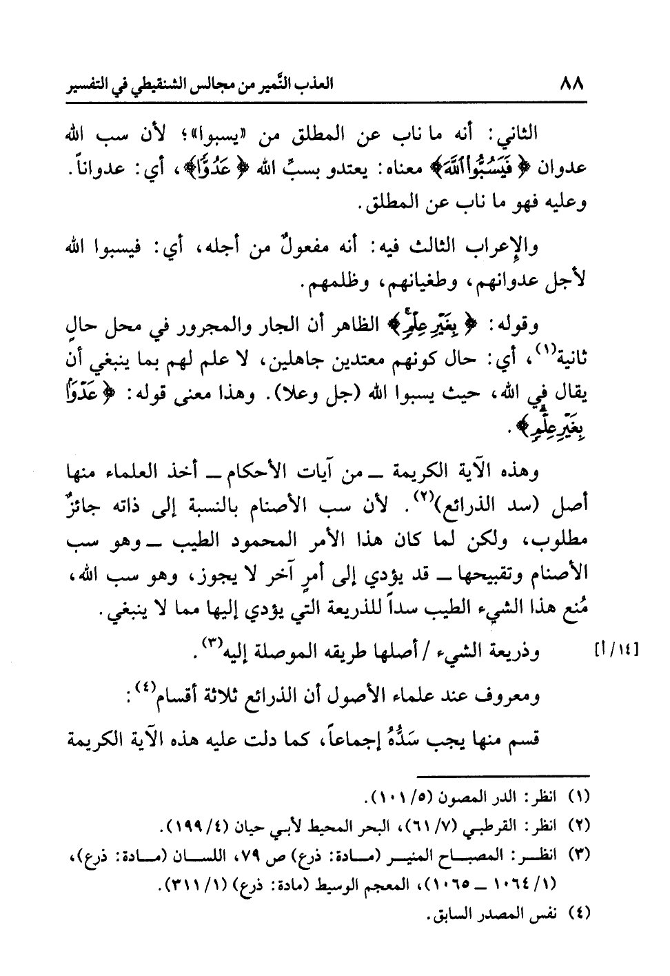 وهذه الآيةُ الكريمةُ - من آياتِ الأحكامِ - أَخَذَ العلماءُ منها أصلَ (سَدِّ الذرائعِ) (¬2)؛ لأَنَّ سَبَّ الأصنامِ بالنسبةِ إلى ذاتِه جَائِزٌ مطلوبٌ، ولكن لَمَّا كان هذا الأمرُ المحمودُ الطيبُ - وهو سَبُّ الأصنامِ وتقبيحُها - قد يُؤَدِّي إلى أمرٍ آخرَ لا يجوزُ، وهو سَبُّ اللَّهِ، مُنِعَ هذا الشيءُ الطيبُ سدًّا للذريعةِ التي
