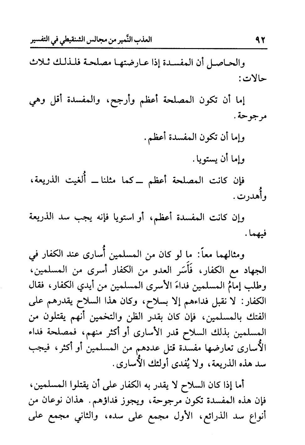 أما إذا كان السلاحُ لا يَقْدِرُ به الكفارُ على أن يقتلوا المسلمين، فإن هذه المفسدةَ تكونُ مرجوحةً، ويجوزُ فداؤُهم. هذانِ نوعانِ من أنواعِ سَدِّ الذرائعِ، الأولُ مُجْمَعٌ على سَدِّهِ، والثاني مُجْمَعٌ على