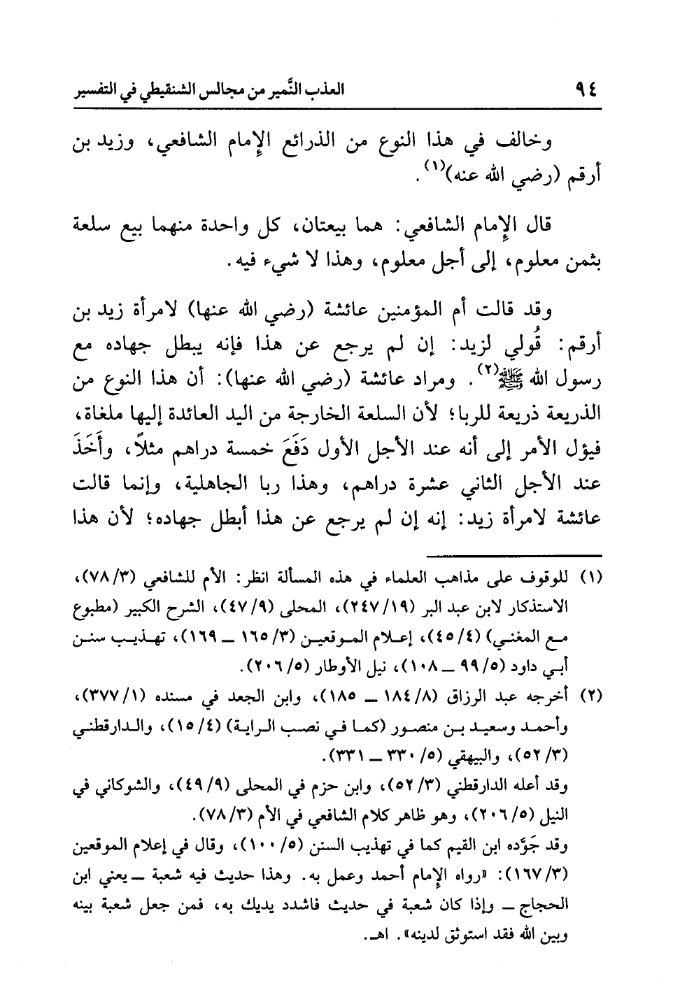 ومرادُ عائشةَ (رضي الله عنها): أن هذا النوعَ من الذريعةِ ذريعةٌ لِلرِّبَا؛ لأن السلعةَ الخارجةَ من اليدِ العائدةَ إليها مُلْغَاةٌ، فَيَؤُلُ الأمرُ إلى أنه عندَ الأجلِ الأولِ دَفَعَ خمسةَ دراهمَ مثلاً، وأخَذَ عِنْدَ الأجلِ الثاني عشرةَ دراهمَ، وهذا رِبَا الجاهليةِ، وإنما قالت عائشةُ لامرأةِ زَيْدٍ: إنه إن لَمْ يرجع عن هذا أَبْطَلَ جِهَادَهُ؛ لأن هذا