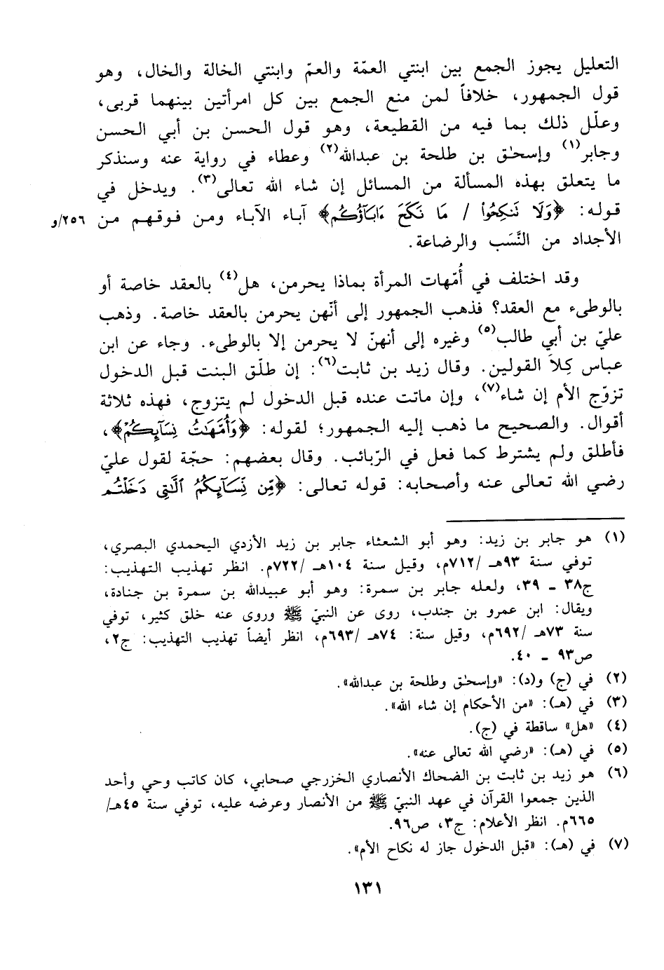 التعليل يجوز الجمع بين ابنتي العمة والعم، وابنتي الخالة والخال، وهو قول الجمهور، خلافًا لمن منع الجمع بين كل امرأتين بينهما قربى، وعلل ذلك بما فيه من القطيعة، وهو قول الحسن بن أبي الحسن وجابر وإسحاق بن طلحة بن عبد الله وعطاء في رواية عنه وسنذكر ما يتعلق بهذه المسألة من المسائل إن شاء الله تعالى. ويدخل في قوله: {ولا تنكحوا ما نكح آباؤكم} آباء الآباء ومن فوقعهم من الأجداد من النسب والرضاعة.