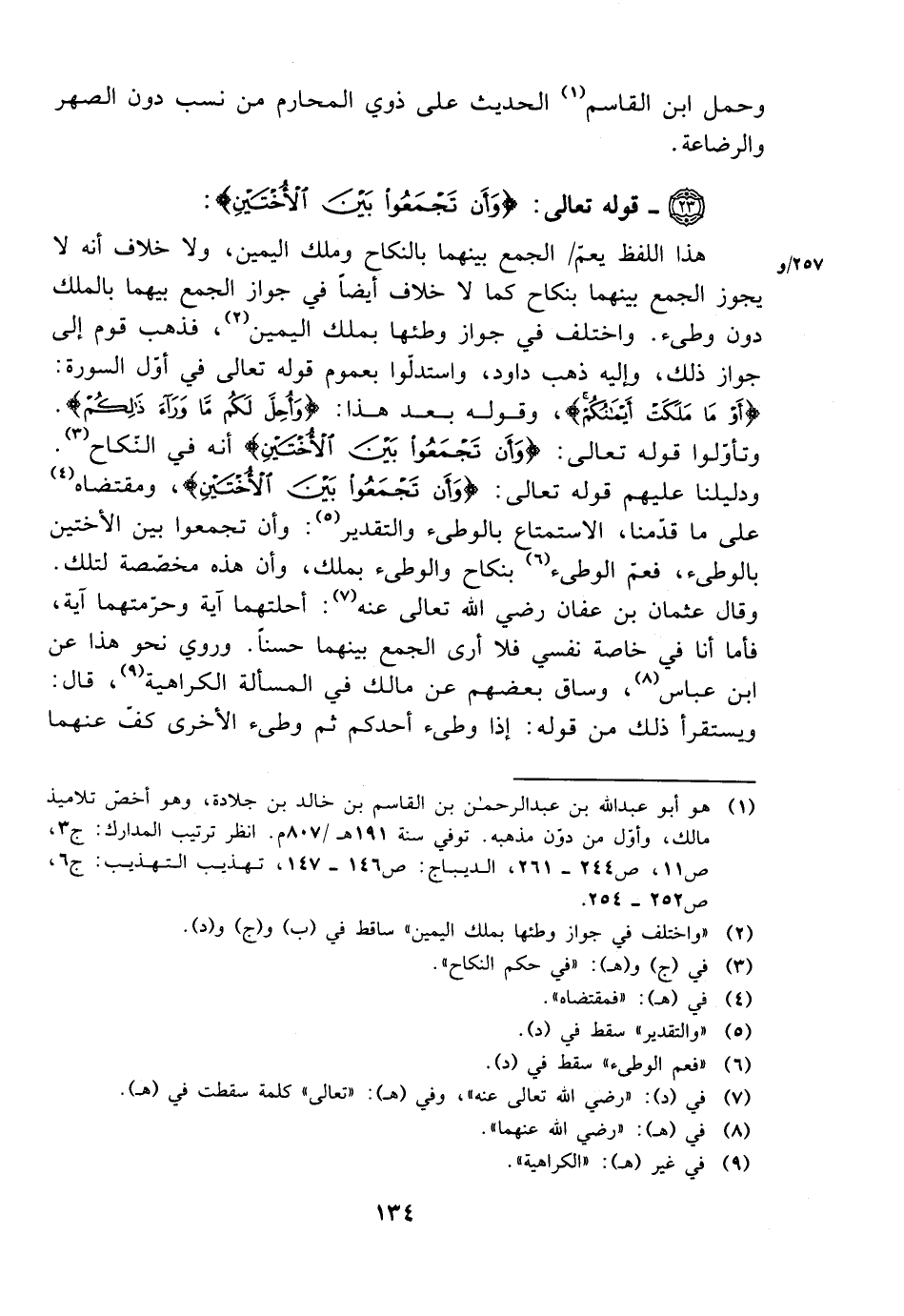 وقال عثمان بن عفان رضي الله تعالى عنه: أحلتهما آية وحرمتهما آية، فأما أنا في خاصة نفسي فلا أرى الجمع بينهما حسنًا. وروي نحو هذا عن ابن عباس، وساق بعضهم عن مالك في المسألة الكراهية، قال: ويستقرأ ذلك من قوله: إذا وطئ أحدكم ثم وطئ الأخرى كف عنهما