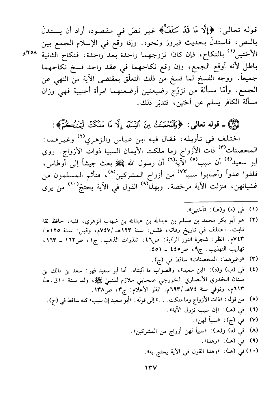 اختلف في تأويله، فقال فيه ابن عباس والزهري وغيرهما: المحصنات ذات الأزواج وما ملكت الأيمان السبيا ذوات الأزواج. وروى أبو سعيد أن سبب الآية أن رسول الله صلى الله عليه وسلم بعث جيشًا إلى أوطاس، فلقوا عدوًا وأصابوا سبيًا من أزواج المشركين، فتأثم المسلمون من غشيانهن، فنزلت الآية مرخصة. وبهذا القول في الآية يحتج من يرى