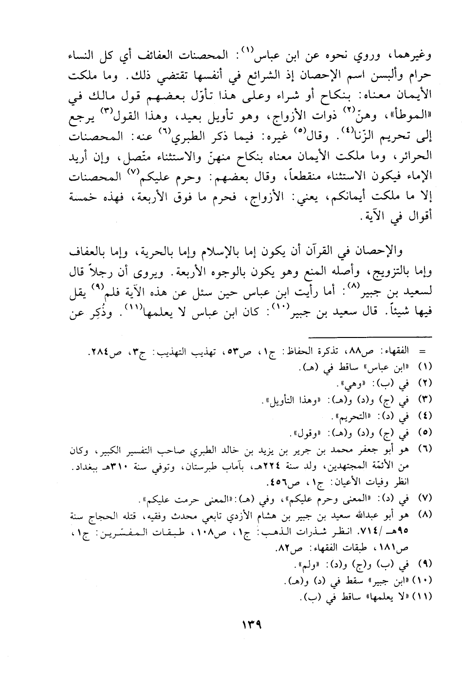 والإحصان في القرآن أن يكون إما بالإسلام وإما بالجزية، وإما بالعفاف وإما بالتزويج، وأصله المنع وهو يكون بالوجوه الأربعة. ويروى أن رجلًا قال لسعيد بن جبير: أما رأيت ابن عباس حين سئل عن هذه الآية فلم يقل فيها شيئًا. قال سعيد بن جبير: كان ابن عباس لا يعلمها. وذكر عن