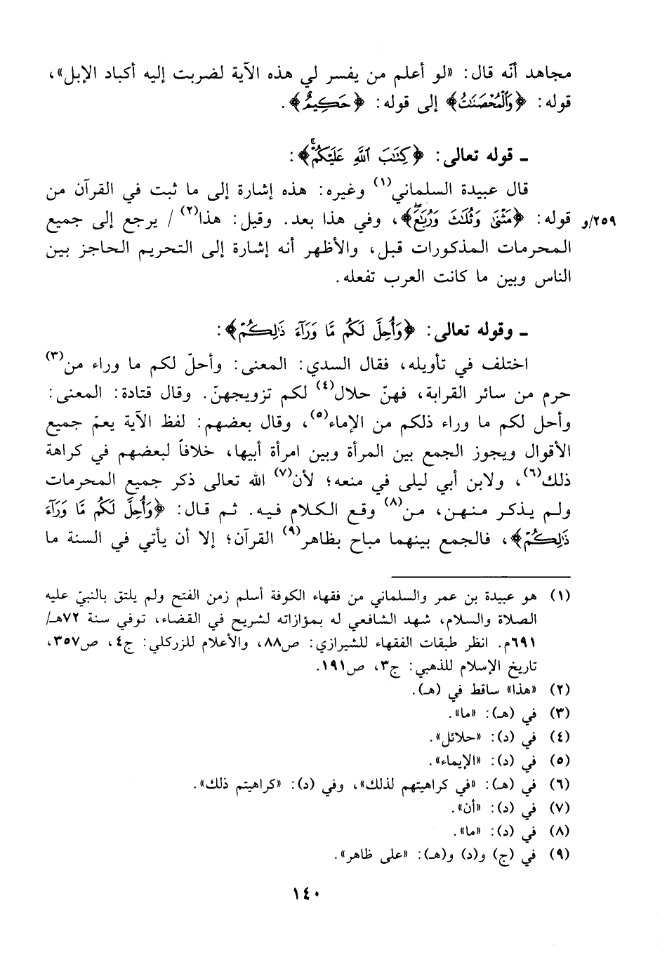 مجاهد أنه قال: ((لو أعلم من يفسر لي هذه الآية لضربت إليه أكباد الإبل))، قوله: {والمحصنات} إلى قوله: {حكيم}.