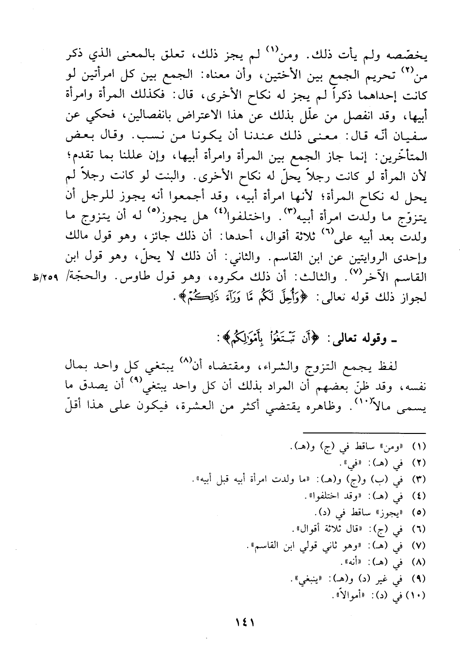 لفظ يجمع التزوج والشراء، ومقتضاه أن يبتغي أن يصدق كل واحد بمال نفسه، وقد ظن بعضهم أن المراد بذلك أن كل واحد يبتغي أن يصدق ما يسمى مالًا. وظاهره يقتضي أكثر من العشرة، فيكون على هذا أقل