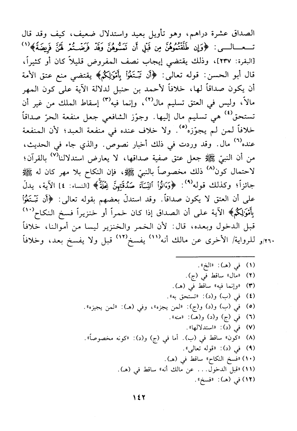 الصداق عشرة دراهم، وهو تأويل بعيد واستدلال ضعيف، كيف وقد قال تعالى: {وإن طلقتموهن من قبل أن تمسوهن وقد فرضتم لهن فريضة} [البقرة: 237]، وذلك يقتضي إيجاب نصف المفروض قليلًا كان أو كثيرًا، قال أبو الحسن: قوله تعالى: {أن تبتغوا بأموالكم} يقتضي منع عتق الأمة أن يكون صداقًا لها، خلافًا لأحمد بن حنبل لدلالة الآية على كون المهر مالًا، وليس في العتق تسليم مال، وإنما فيه إسقاط الملك من غير أن تستحق هي تسليم مال إليها. وجوز الشافعي جعل منفعة الحر صداقًا خلافًا لمن لم يجوزه. ولا خلاف عنده في منفعة العبد؛ لأن المنفعة عنده مال. وقد وردت في ذلك أخبار نصوص. والذي جاء في الحديث، من أن النبي صلى الله عليه وسلم جعل عتق صفية صداقها، لا يعارض استدلالنا بالقرآن؛ لاحتمال كون ذلك مخصوصًا بالنبي صلى الله عليه وسلم، فإن النكاح بلا مهر كان له صلى الله عليه وسلم جائزًا؛ وكذلك قوله: {وآتوا النساء صدقاتهن نحلة} [النساء: 4] الآية، يدل على أن العتق لا يكون صداقًا. وقد استدل بعضهم بقوله تعالى: {أن تبتغوا بأموالكم} الآية على أن الصداق إذا كان خمرًا أو حنزيرًا فسخ النكاح قبل الدخول وبعده، قال: لأن الخمر والحنزير ليسا من أموالنا، خلافًا للرواية الأخرى عن مالك أنه يفسخ قبل ولا يفسخ بعد، وخلافًا
