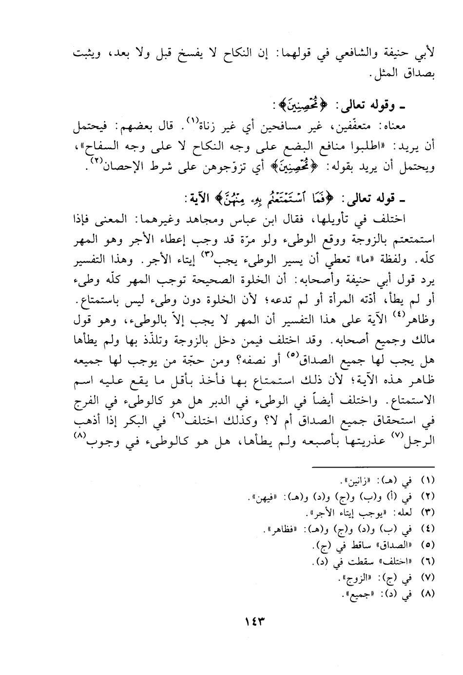 معناه: متعففين، غير مسافحين أي غير زناة. قال بعضهم: فيحتمل أن يريد: ((اطلبوا منافع البضع على وجه النكاح لا على وجه السفاح))، ويحتمل أن يريد بقوله: {محصنين} أي تزوجوهن على شرط الإحصان.