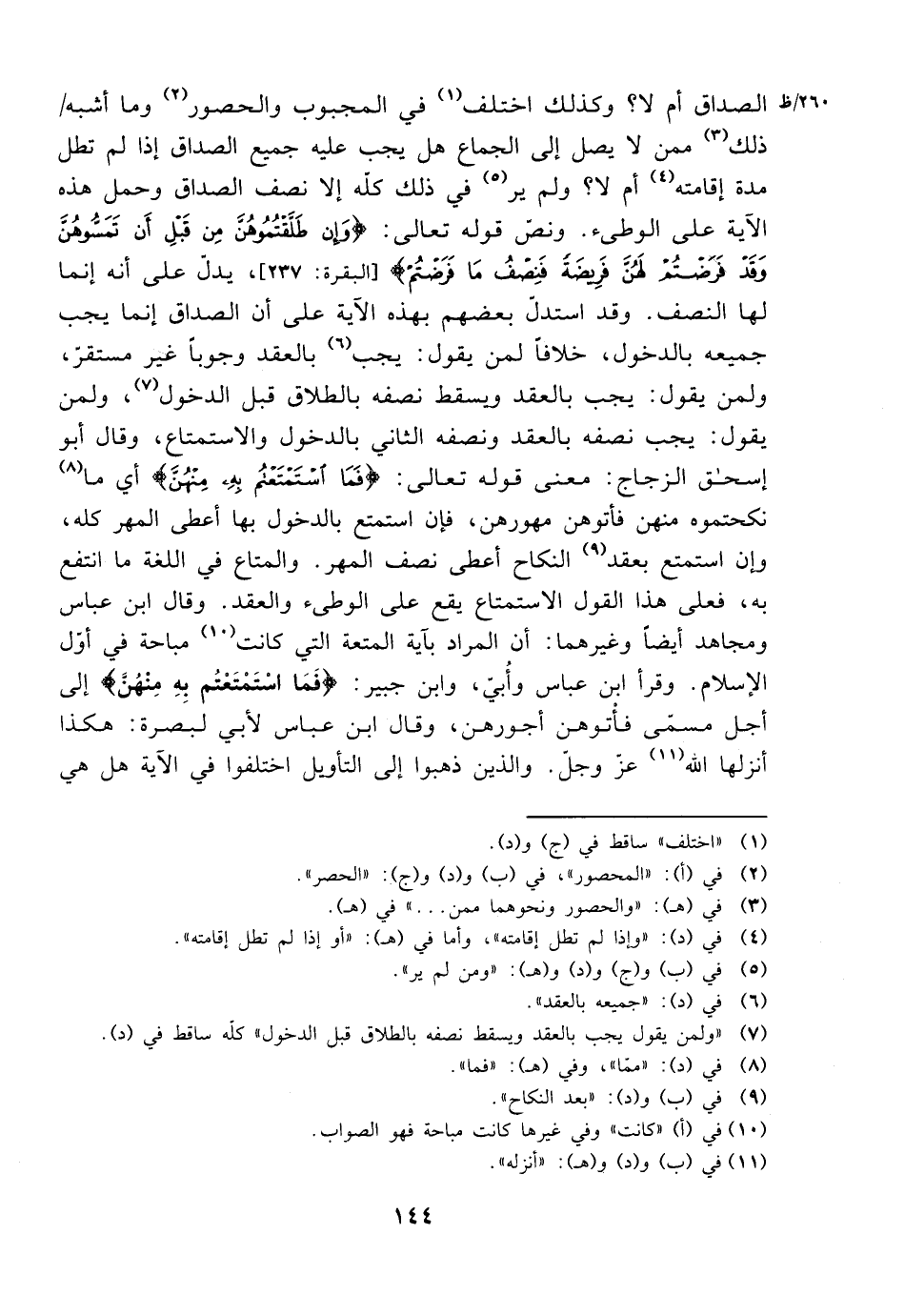 الصداق أم لا؟ وكذلك اختلف في المجبوب والحصور وما أشبه ذلك ممن لا يصل إلى الجماع هل يجب عليه الصداق إذا لم تطل مدة إقامته أم لا؟ ولم ير في ذلك كله إلا نصف الصداق وحمل هذه الآية على الوطئ. ونص قوله تعالى: {وإن طلقتموهن من قبل أن تمسوهن وقد فرضتم لهن فريضة فنصف ما فرضتم} [البقرة: 237]، يدل على أنه إنما لها النصف. وقد استدل بعضهم بهذه الآية على أن الصداق إنما يجب جميعه بالدخول، خلافًا لمن يقول: يجب بالعقد وجوبًا غير مستقر، ولمن يقول: يجب بالعقد ونصفه بالطلاق قبل الدخول، ولمن يقول: يجب نصفه بالعقد ونصفه الثاني بالدخول والاستمتاع، وقال أبو إسحاق الزجاج: معنى قوله تعالى: {فما استمتعتم به منهن} أي ما نكحتموه منهن فأتوهن مهورهن، فإن استمتع بالدخول بها أعطي المهر كله، وإن استمتع بعقد النكاح أعطى نصف المهر. والمتاع في اللغة ما انتفع به، فعلى هذا القول الاستمتاع يقع على الوطئ والعقد. وقال ابن عباس ومجاهد أيضًا وغيرهما: أن المراد بآية المتعة التي كانت مباحة في أول الإسلام. وقرأ ابن عباس وأبي، وابن جبير: {فما استمتعتم به منهن} إلى أجل مسمى فأتوهن أجورهن، وقال ابن عباس لأبي لبصرة: هكذا أنزلها الله عز وجل. والذين ذهبوا إلى التأويل اختلفوا في الآية هل هي