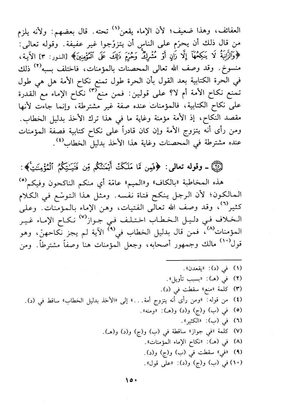 هذه المخاطبة ((بالكاف)) و ((الميم)) عامة أي منكم الناكحون وفيكم المالكون؛ لأن الرجل ينكح فتاة نفسه. ومثل هذا التوسع في الكلام كثير، وقد وصف الله تعالى الفتيات، وهن الإماء بالمؤمنات. وعلى الخلاف في دليل الخطاب اختلف في جواز نكاح الإماء غير المؤمنات، فمن قال بدليل الخطاب في الآية لم يجز نكاحهن، وهو قول مالك وجمهور أصحابه، وجعل المؤمنات هنا وصفًا مشترطًا. ومن