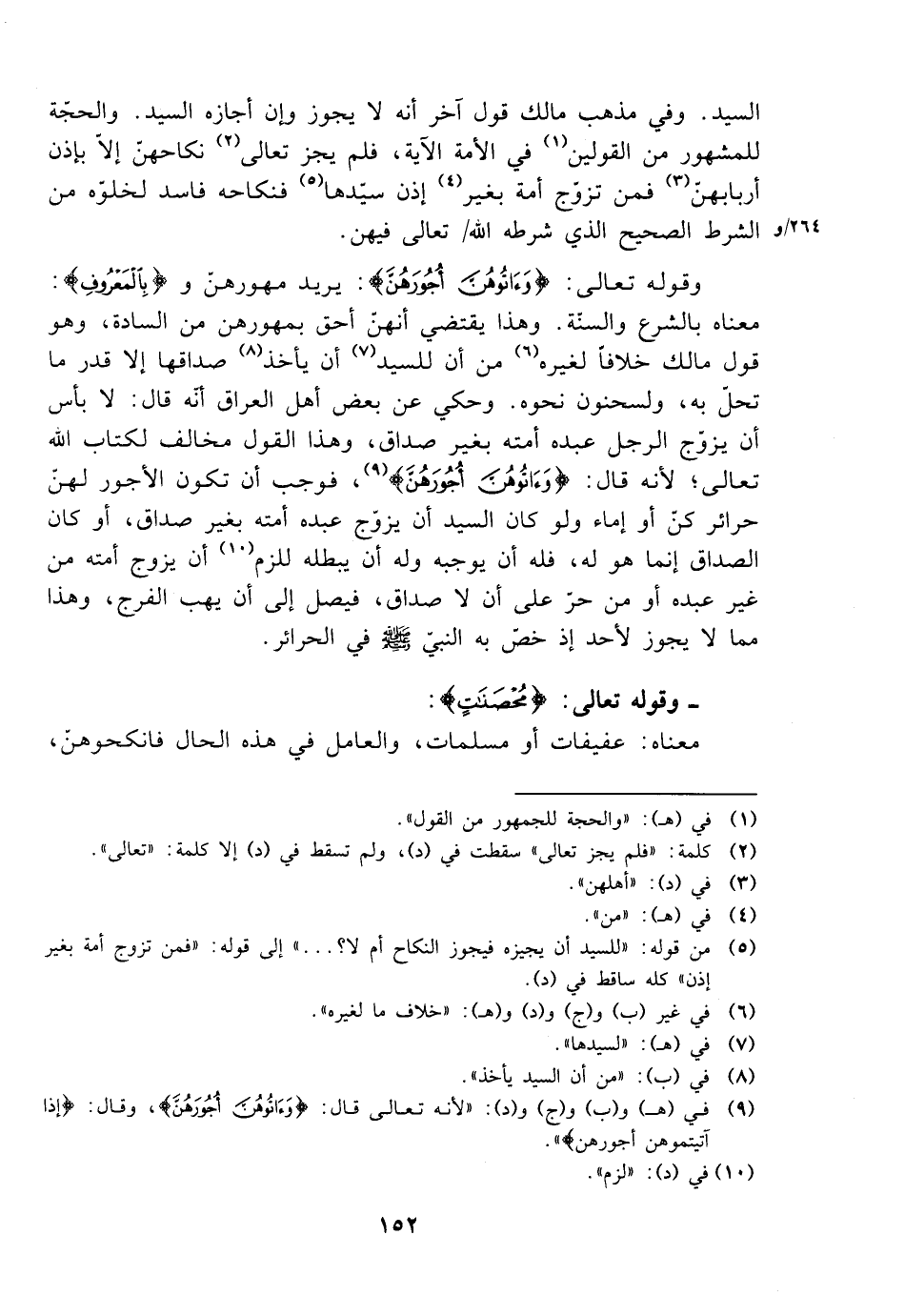 السيد. وفي مذهب مالك قول آخر أنه لا يجوز وإن أجازه السيد. والحجة للمشهور من القولين في الأمة الآية، فلم يجز تعالى نكاحهن إلا بإذن أربابهن فمن تزوج أمة بغير إذن سيدها فنكاحه فاسد لخلوه من الشرط الصحيح الذي شرطه الله تعالى فيهن.