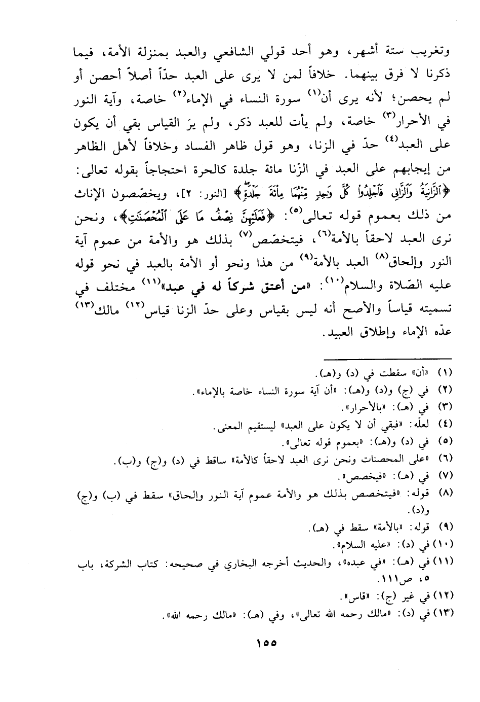 وتغريب ستة أشهر، وهو أحد قولي الشافعي والعبد بمنزلة الأمة، فيما ذكرنا لا فرق بينهما. خلافًا لمن لا يرى على العبد حدًا أصلًا أحصن أو لم يحصن؛ لأنه يرى أن سورة النساء في الإماء خاصة، وآية النور في الأحرار خاصة، ولم يأت للعبد ذكر، ولم ير القياس بقي أن يكون على العبد حد في الزنا، وهو قول ظاهر الفساد وخلافًا لأهل الظاهر من إيجابهم على العبد في الزنا مائة جلدة كالحرة احتجاجًا بقوله تعالى: {الزانية والزاني فاجلدوا كل واحد منهما مائة جلدة} [النور: 2]، ويخصصون الإناث من ذلك بعموم قوله تعالى: {فعليهن نصف ما على المحصنات}، ونحن نرى العبد لاحقًا بالأمة، فيتخصص بذلك هو والأمة من عموم آية النور وإلحاق العبد بالأمة من هذا ونحو أو الأمة بالعبد في نحو قوله عليه الصلاة والسلام: ((من أعتق شركًا له في عبد)) مختلف في تسميته قياسًا والأصح أنه ليس بقياس وعلى حد الزنا قياس مالك عده الإماء وإطلاق العبيد.